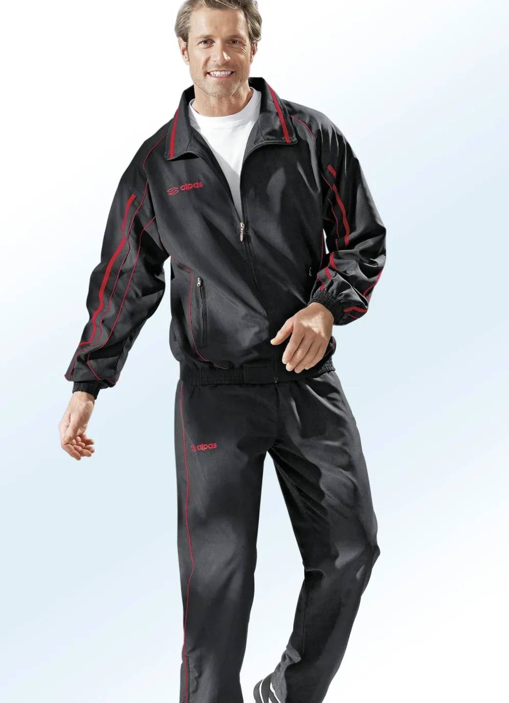 Klasse „alpas“-Freizeitanzug in Schwarz-Rot. Oberteil: zwei Seitentaschen mit Reißverschluss sowie elastische Abschlüsse an den Ärmeln und am Saum. Hose: Kordelzug im Dehnbund, zwei Seitentaschen mit Reißverschluss sowie Reißverschluss an den geraden Beinabschlüssen.