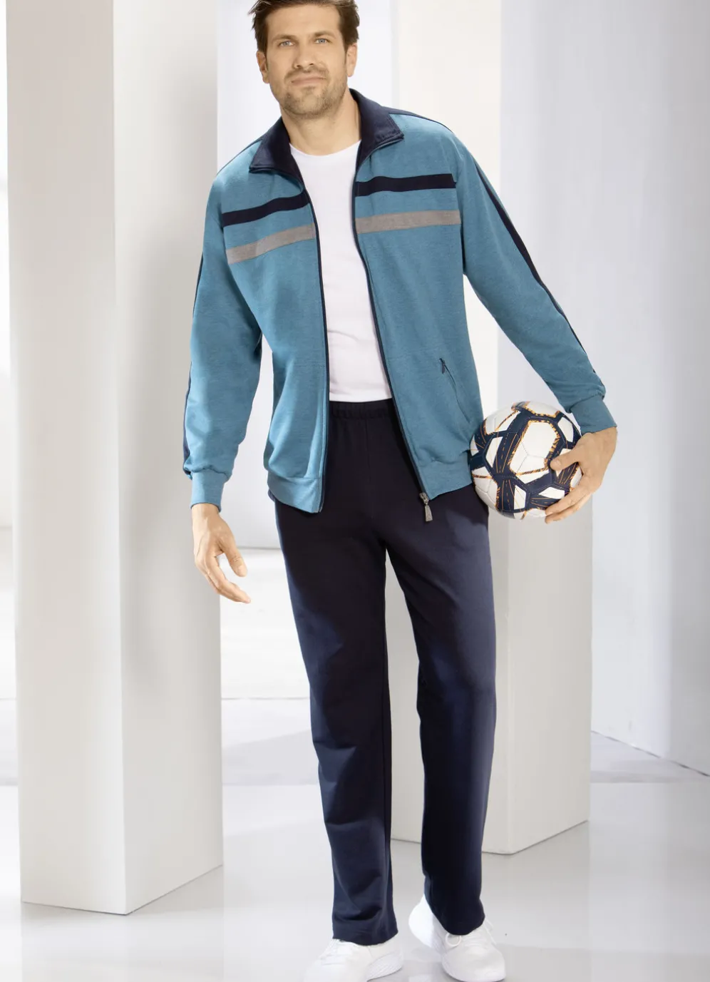 Legerer „Athlet”-Freizeitanzug in Petrol-Marine. Oberteil mit Reißverschluss an den Seitentaschen sowie elastischen Ärmelabschlüssen und Bund aus Strick. Hose mit Dehnbund und Durchzugsband, Seitentaschen und geraden Beinabschlüssen.
