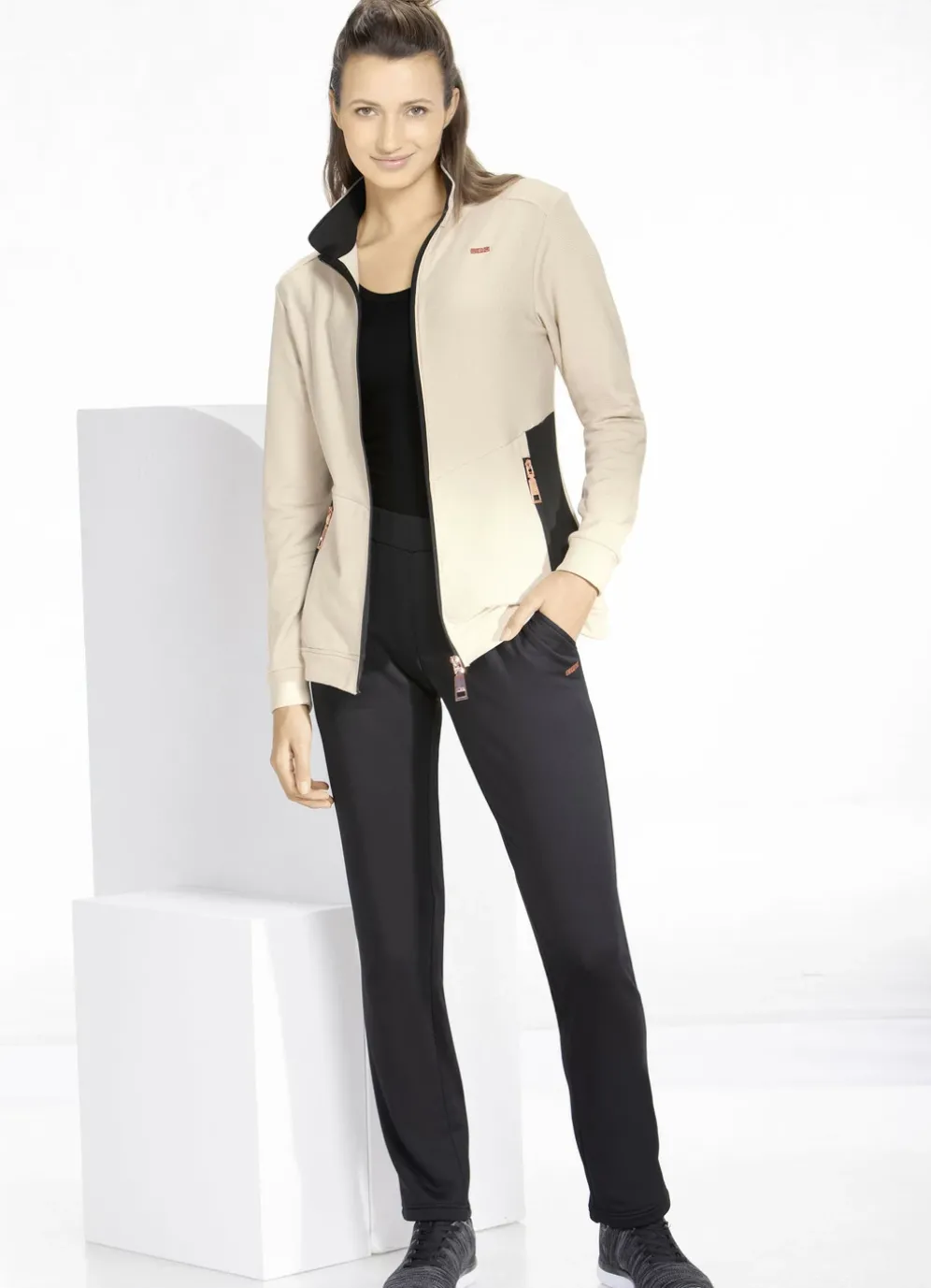 Lassen Sie sich diesen Freizeitanzug von „LPO“ in Beige-Anthrazit nicht entgehen! Mit Stehkragen, Reißverschluss, Seitentaschen mit Reißverschluss, elastischen Ärmelbündchen und Saumabschluss sowie Stickerei links. Hose mit Dehnbund und Seitentaschen, hautsympathische, und angeraute Innenseite.
