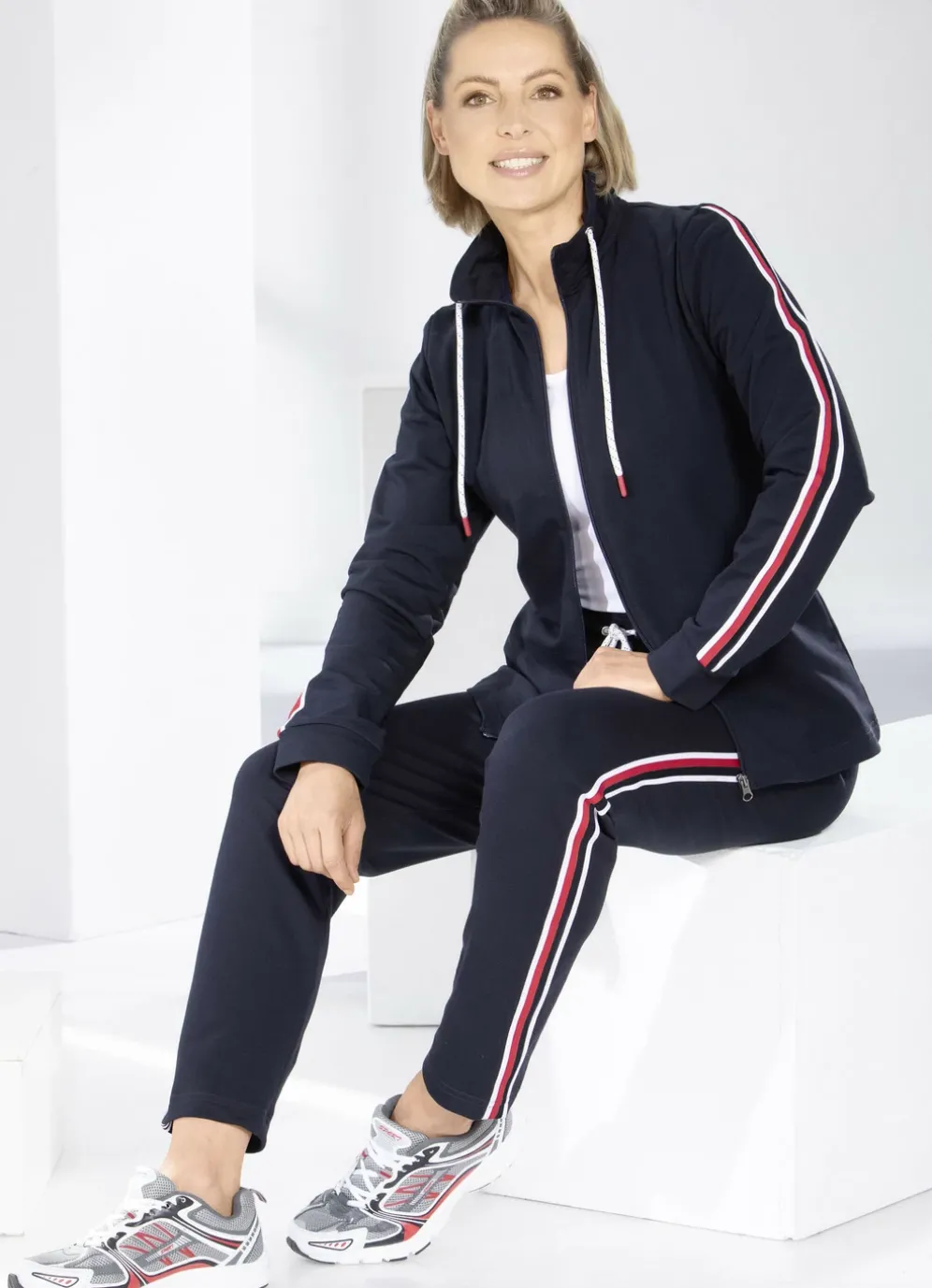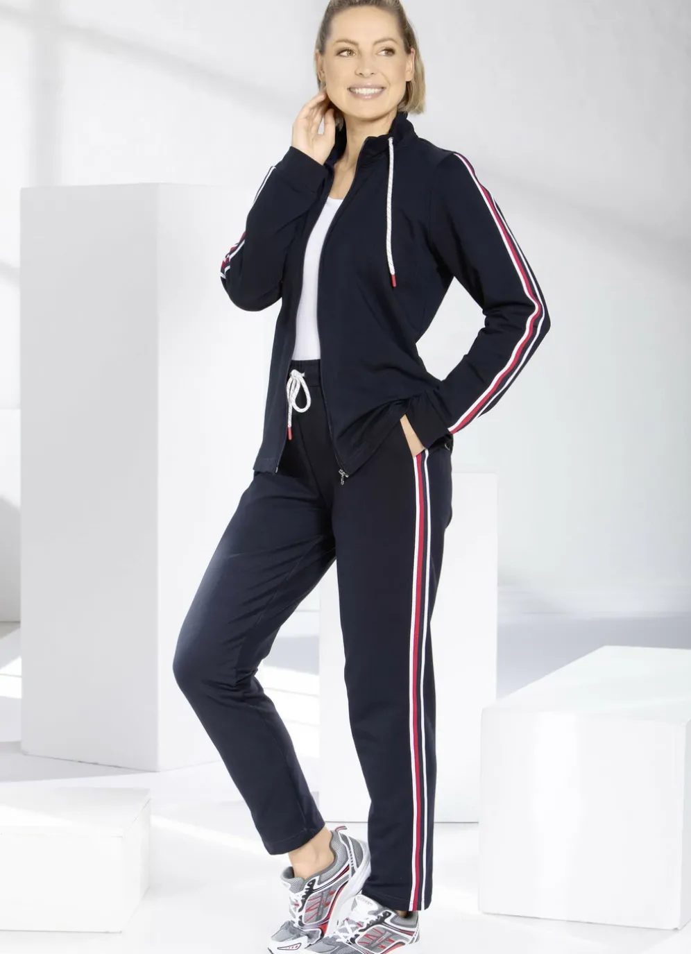 Superschick ist dieser „Plantier“-Freizeitanzug in Marine! Oberteil mit Durchzugsband und Stopper im Umlegekragen, Seitentaschen, sowie Kontrastband an den Ärmeln. Hose mit Durchzugsband und Stopper, Seitentaschen, seitlichem Kontrastband und geraden Beinabschlüssen.