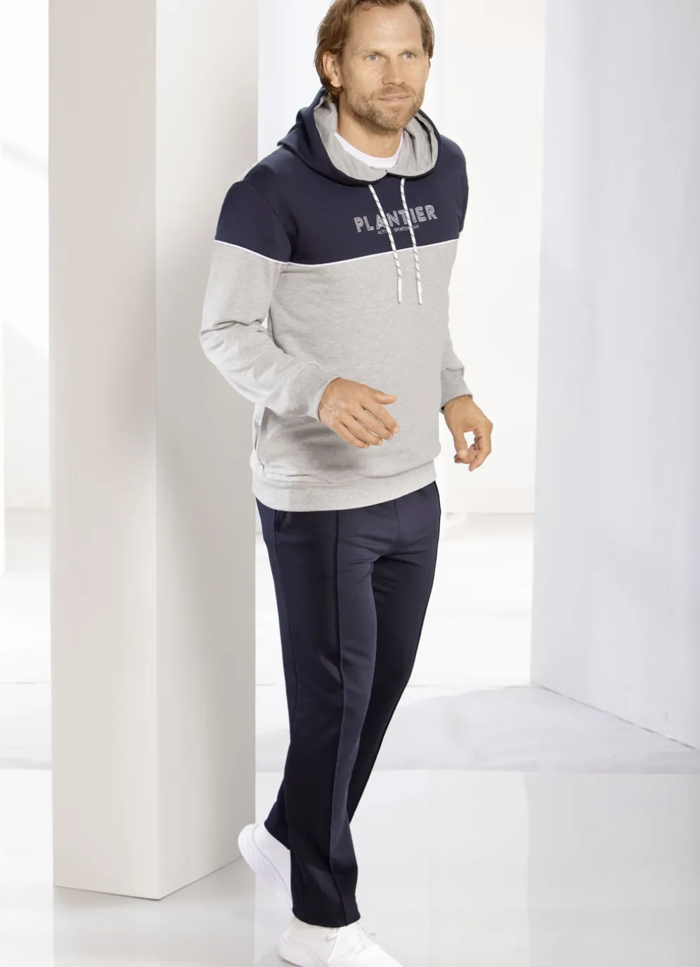 Lässiger „Plantier“-Freizeitanzug in Silbergrau meliert-Marine. Kapuze mit Durchzugsband, seitliche Eingrifftaschen, Hose mit Seitentaschen, Biesennaht sowie geraden Beinabschlüssen.