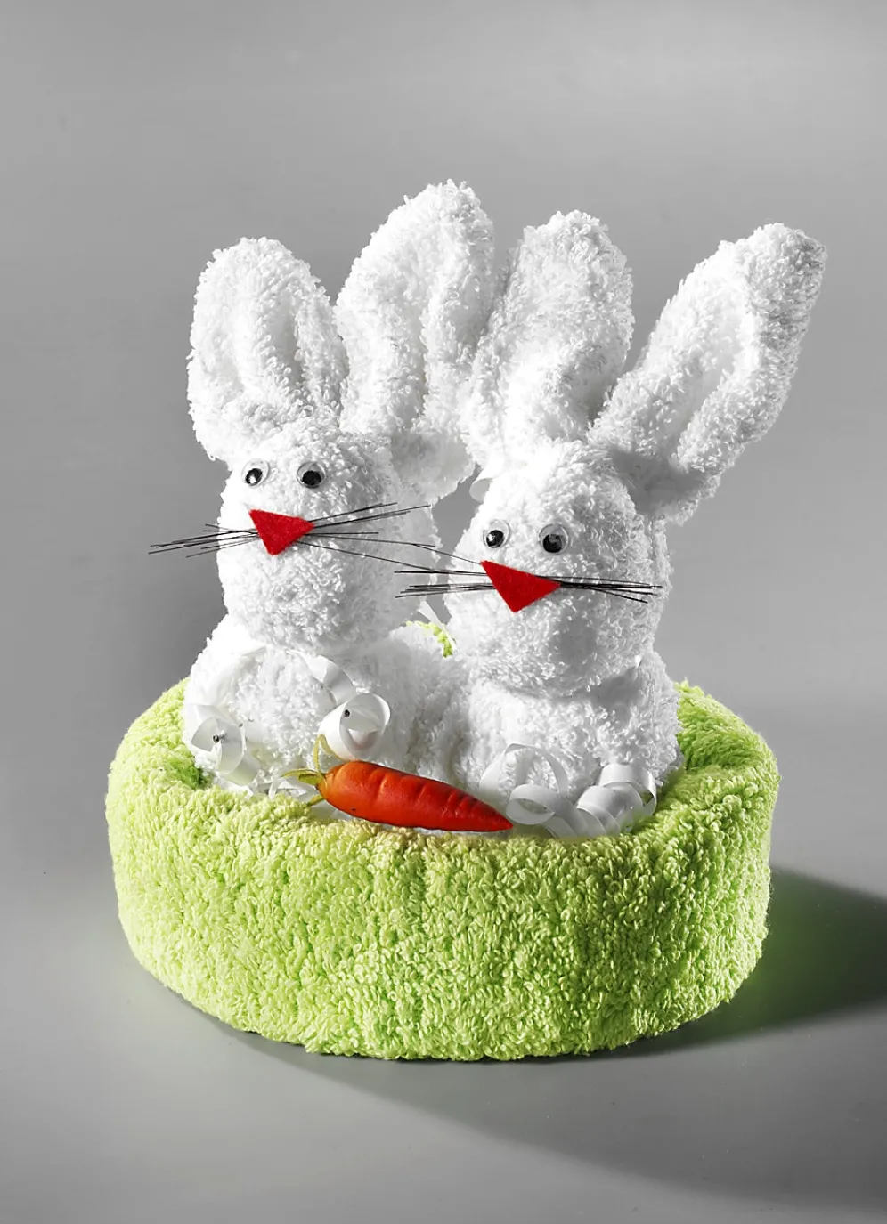 Eine süße Dekorationsidee ist dieses goldige Frottier-Hasenpaar, das aus folgenden Teilen zusammengesetzt ist: 1x Gästehandtuch (30/50 cm), 2x Waschhandschuh (16/21 cm) und Deko Zubehör. Die Qualität: Walkfrottier aus 100% Baumwolle. Waschbar bis 60 °C.