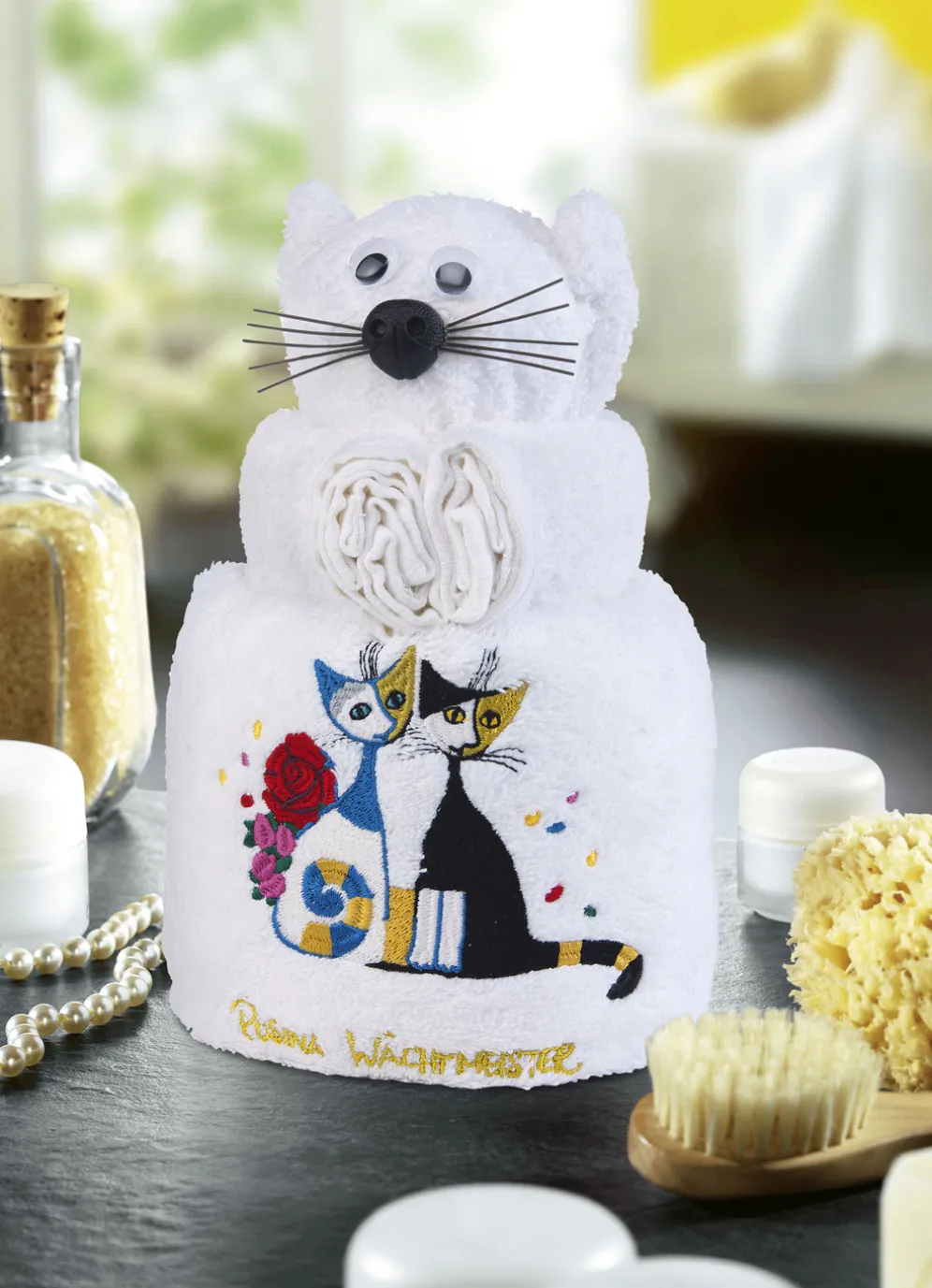 Nicht nur für Katzenfans eine tolle Dekorations- und Geschenkidee! Die Frottier-Katze präsentiert ein schönes Motiv nach einem Entwurf der Künstlerin Rosina Wachtmeister und ist aus folgenden Teilen zusammengesetzt: 1x weißes, besticktes Handtuch (50/100 cm), 1x weißes Gästehandtuch (30/50 cm), 1x weißer Waschhandschuh (15/21 cm) und Dekoration. Die Qualität: Walkfrottier aus 100% Baumwolle. Waschbar bis 60 °C