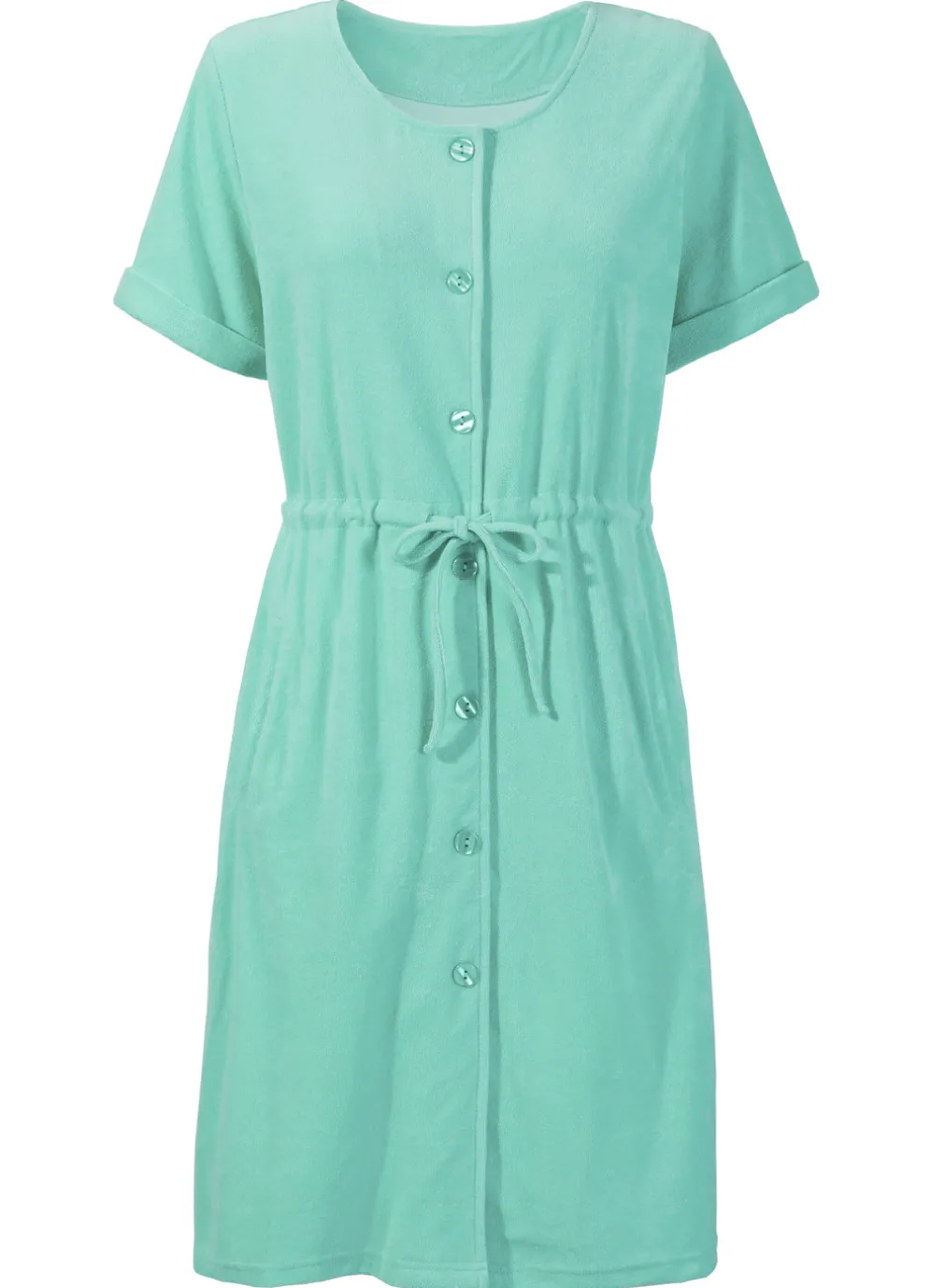 Durchgeknöpftes Kleid mit kurzen Ärmeln, Tunnelzug in Taillenhöhe sowie zwei Taschen. Länge ab 95 cm.