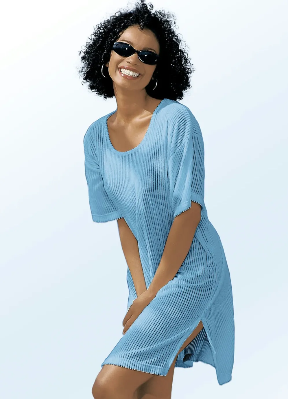 Leicht transparentes Kleid mit Streifenstruktur, großzügigem Halsausschnitt sowie Seitenschlitzen. Länge ab 87 cm.
