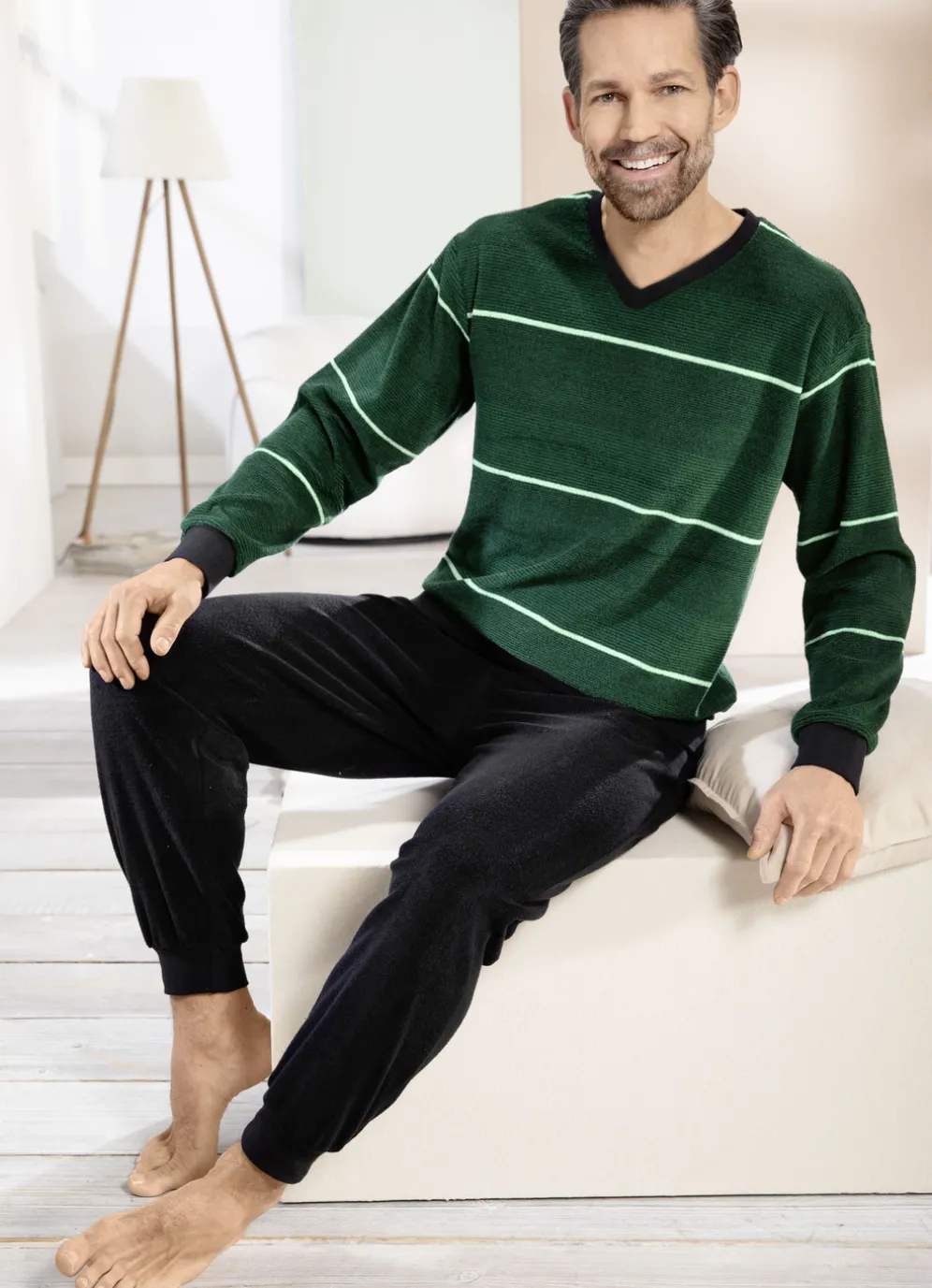Markanter Schlafanzug in Moosgrün-Mint-Schwarz. Oberteil mit garngefärbtem Ringeldessin, V-Ausschnitt sowie Bündchenabschlüssen. Lange Hose mit auswechselbarem Gummizug im Bund, Seitentaschen