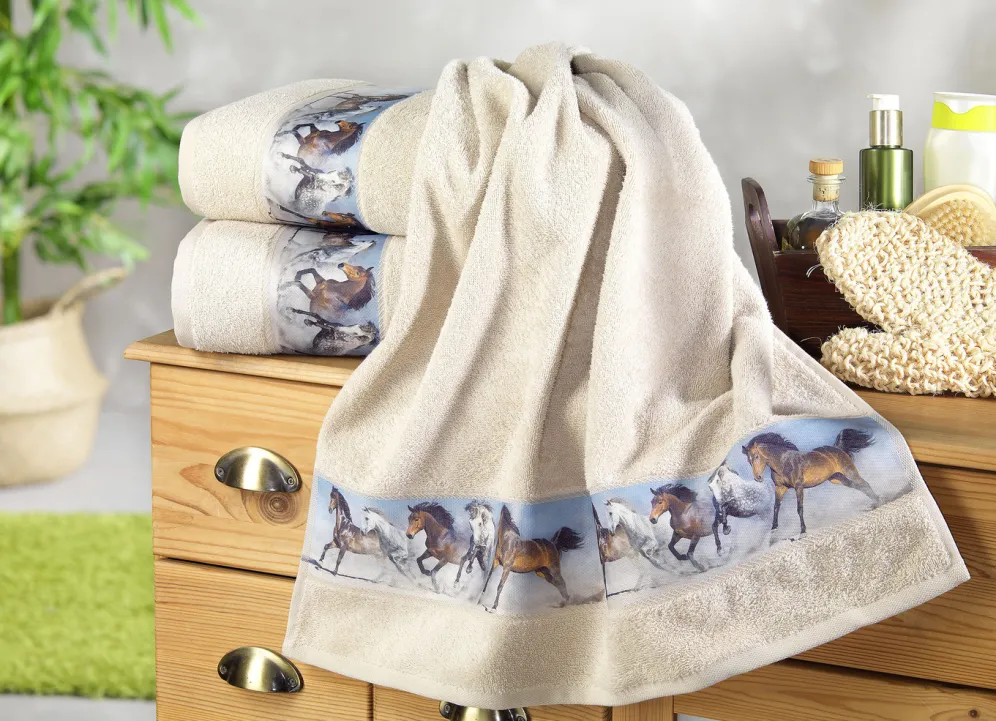 Frottier-Serie mit Digitaldruck in Größe 202 (2 Gästehandtuch 30x 50 cm) und in Creme.