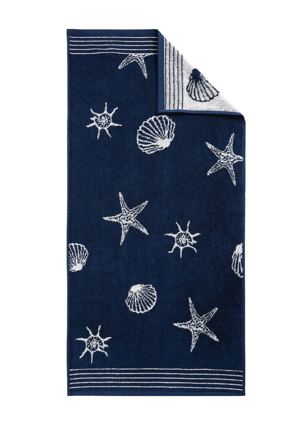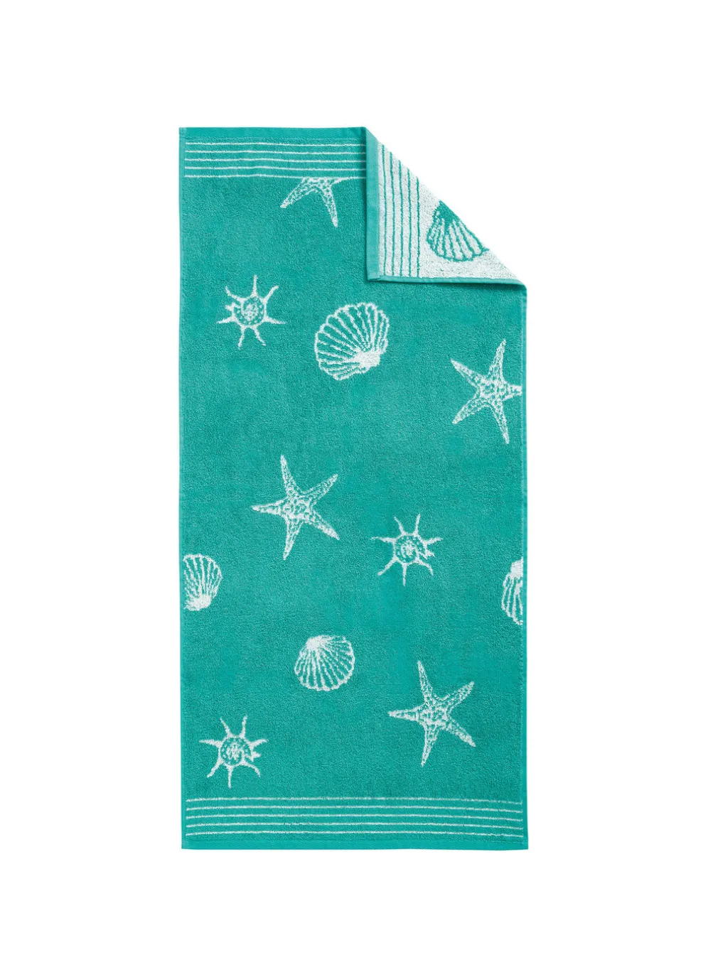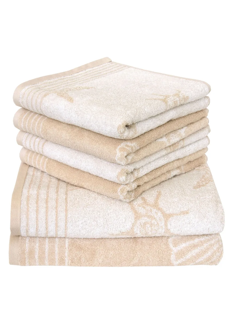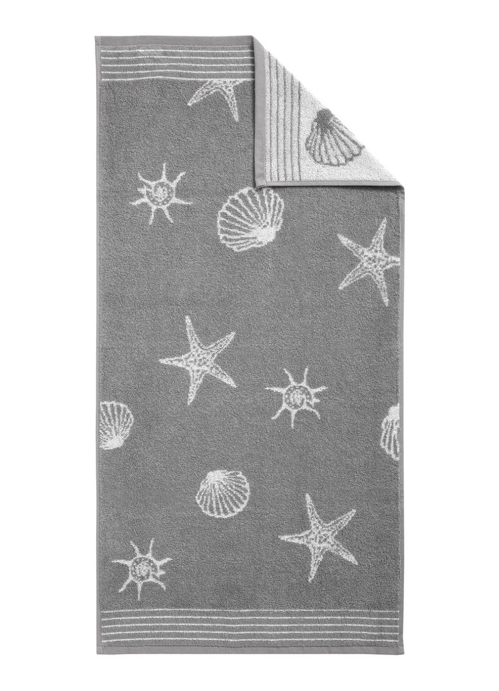 Lassen Sie sich von der maritimen Frottier-Serie mit Muschel- und Seestern-Motiven von Dyckhoff verzaubern und holen Sie sich das Gefühl des Meeres direkt in Ihr Badezimmer. Die dekorativen Streifen im oberen und unteren Bortenbereich verleihen einen harmonischen und stilvollen Abschluss.