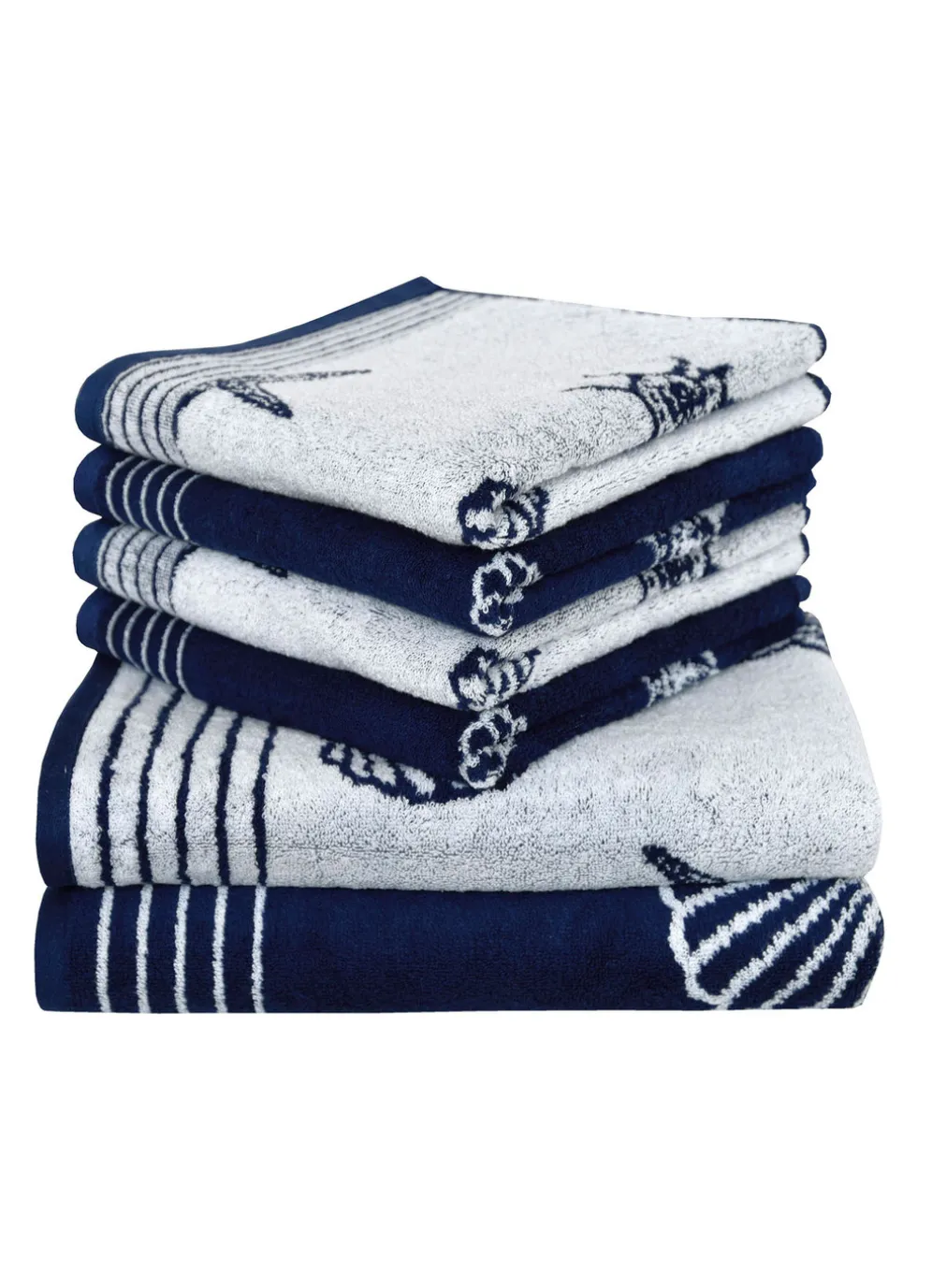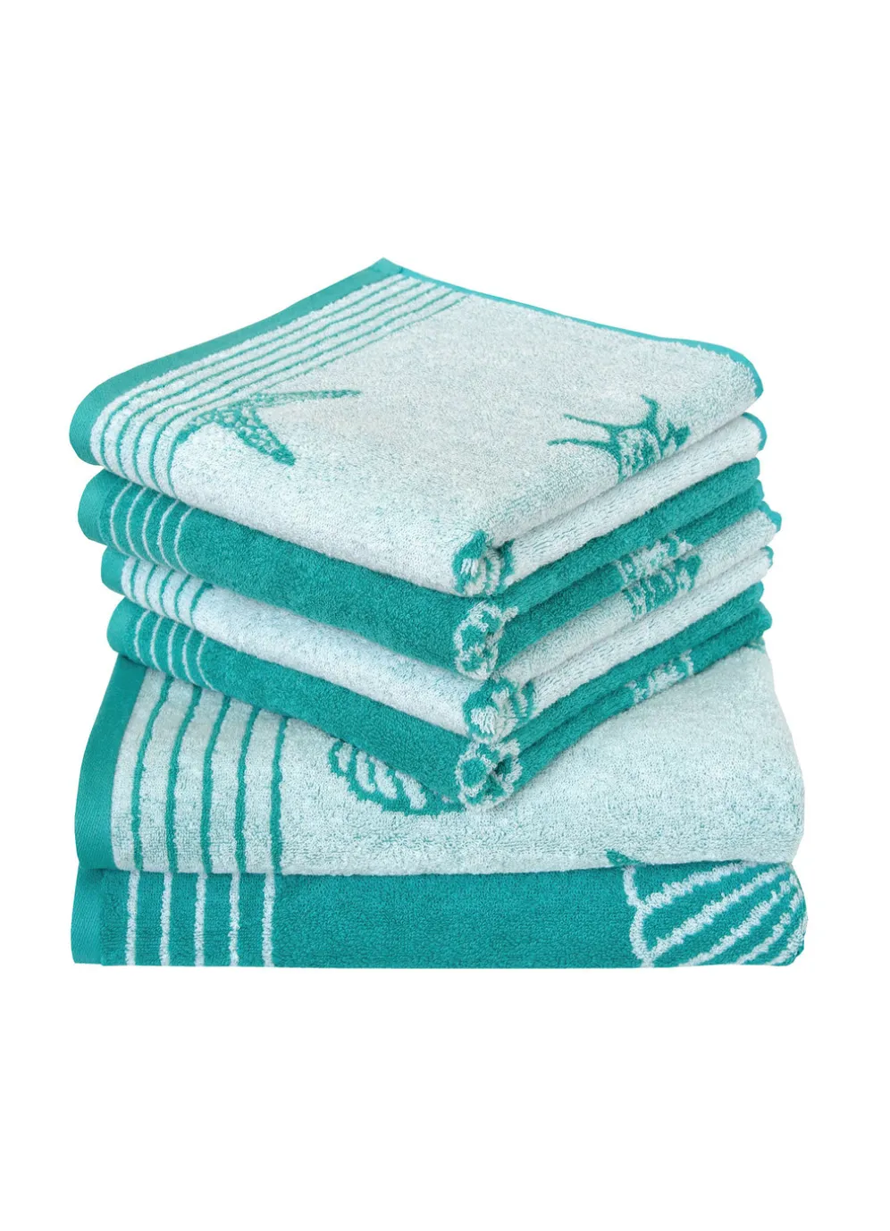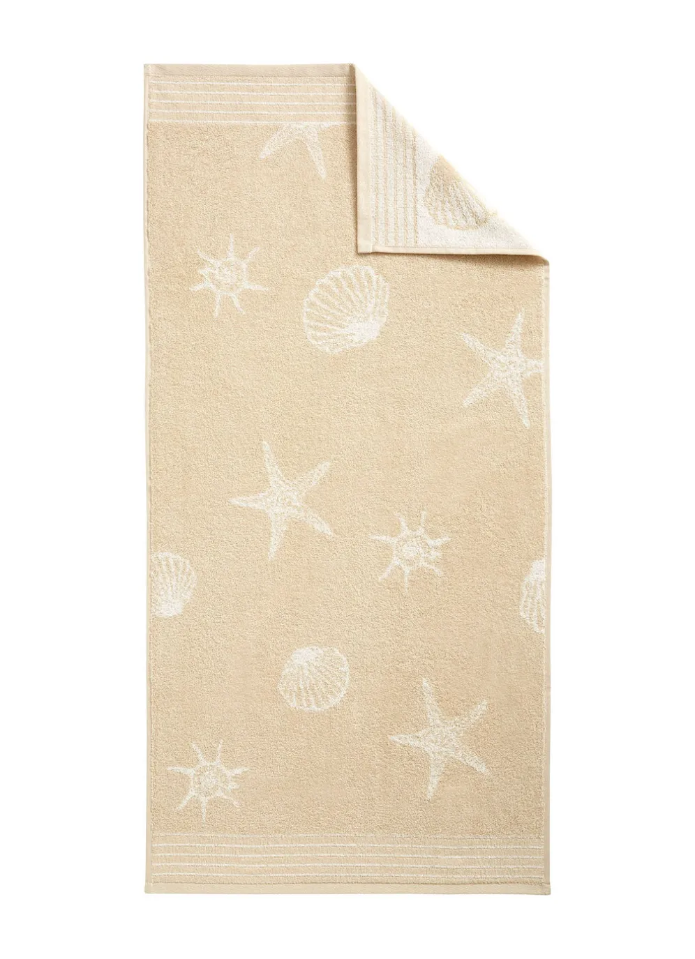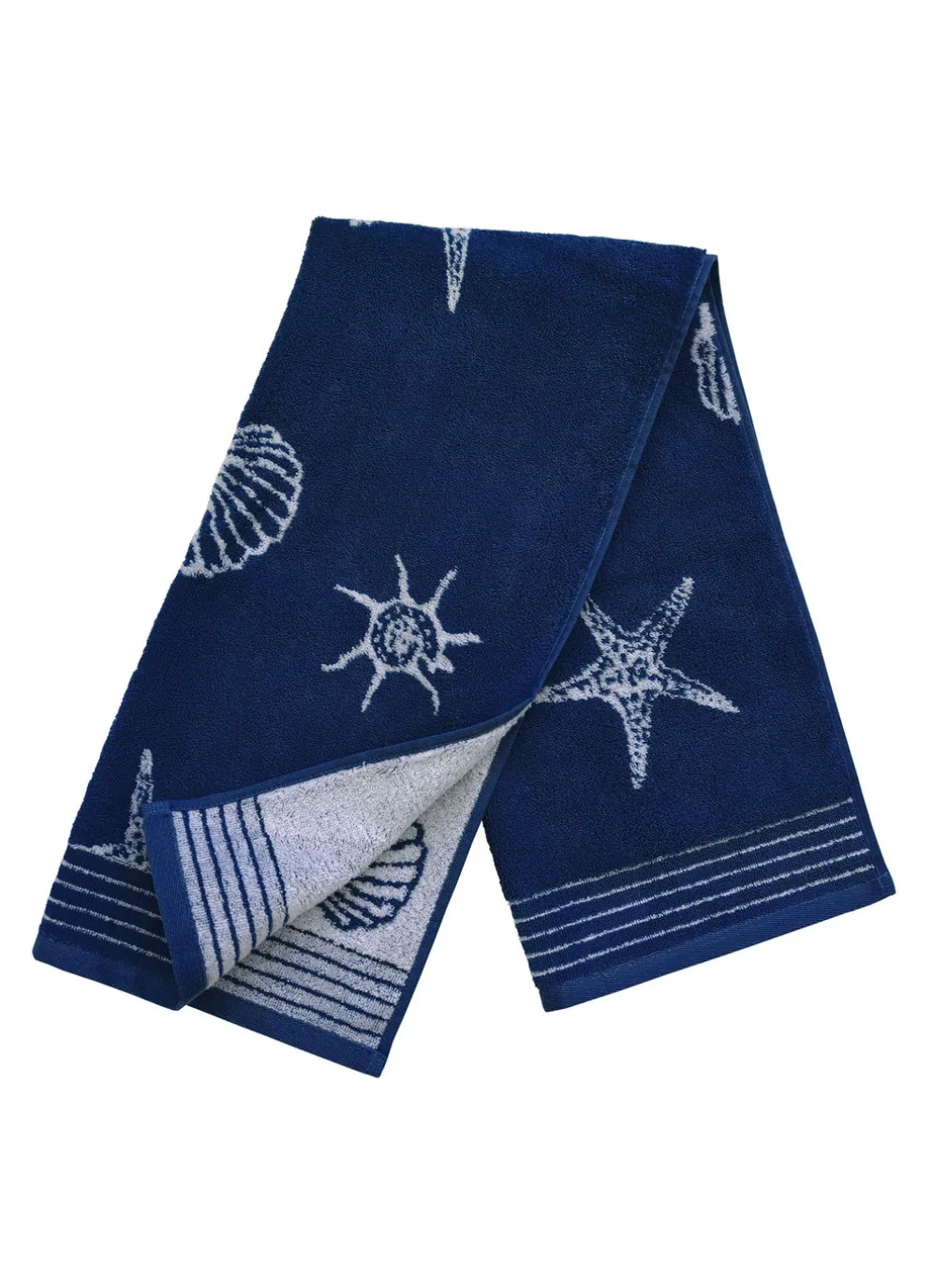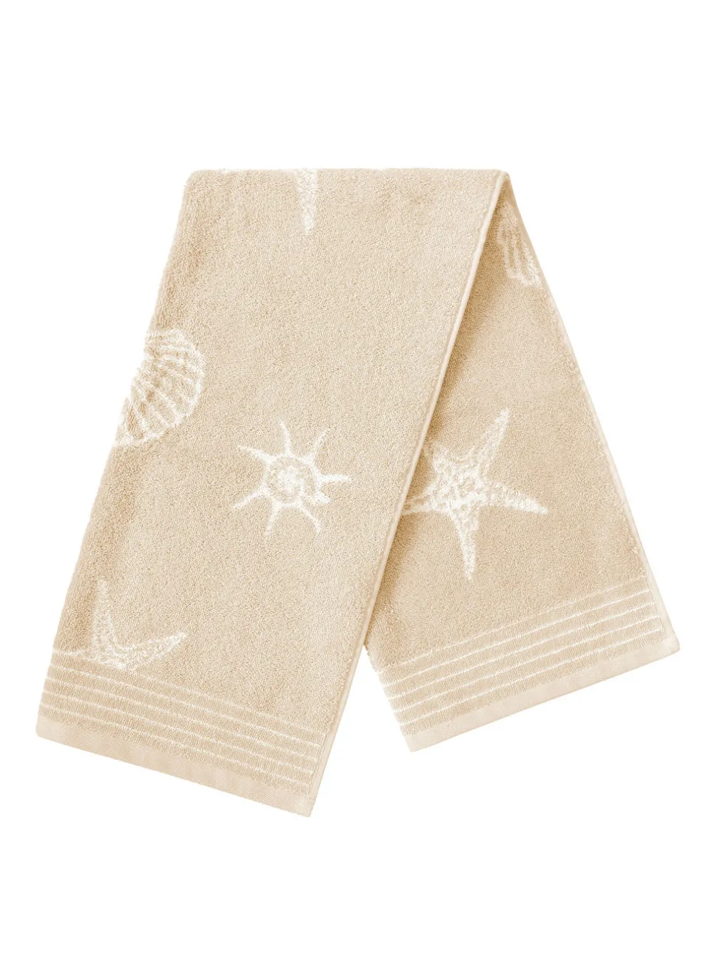Lassen Sie sich von der maritimen Frottier-Serie mit Muschel- und Seestern-Motiven von Dyckhoff verzaubern und holen Sie sich das Gefühl des Meeres direkt in Ihr Badezimmer. Die dekorativen Streifen im oberen und unteren Bortenbereich verleihen einen harmonischen und stilvollen Abschluss.