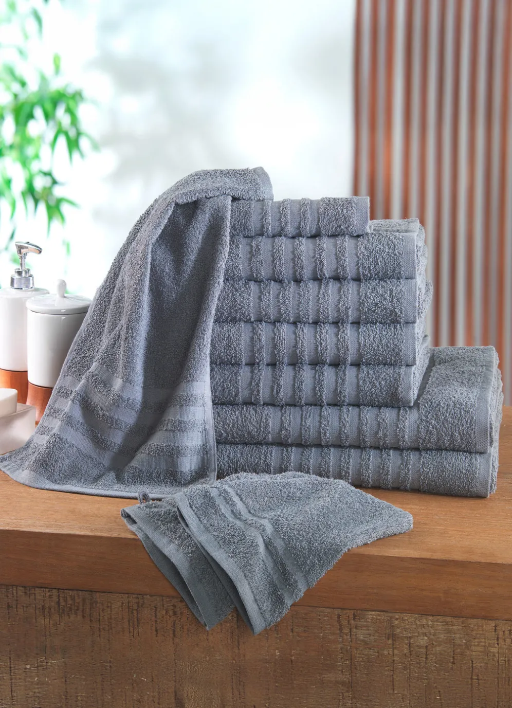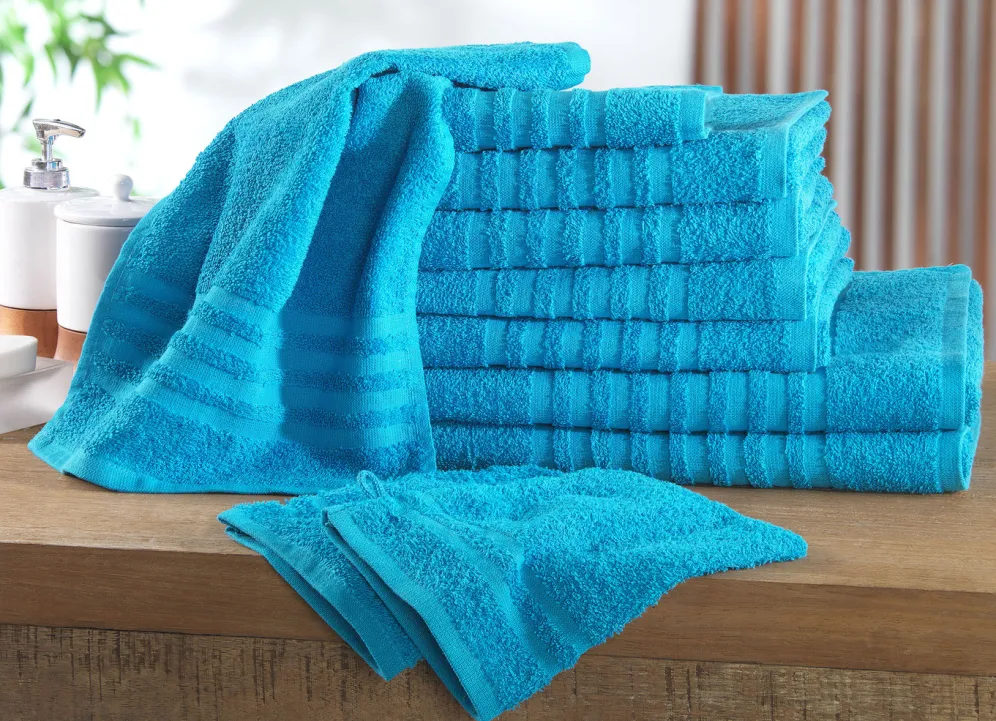 Dieses 10-teilige Frottier-Set mit eleganter Bordüre und Kordelaufhänger bringt frischen Schwung in Ihr Bad! Bestehend aus 4 Handtüchern 50/90 cm, 2 Duschtüchern 65/120 cm, 2 Gästehandtüchern 30/40 cm und 2 Waschhandschuhen 16/21 cm. Qualität: Frottier aus 100% Baumwolle. Waschbar bis 60 °C und trocknergeeignet.