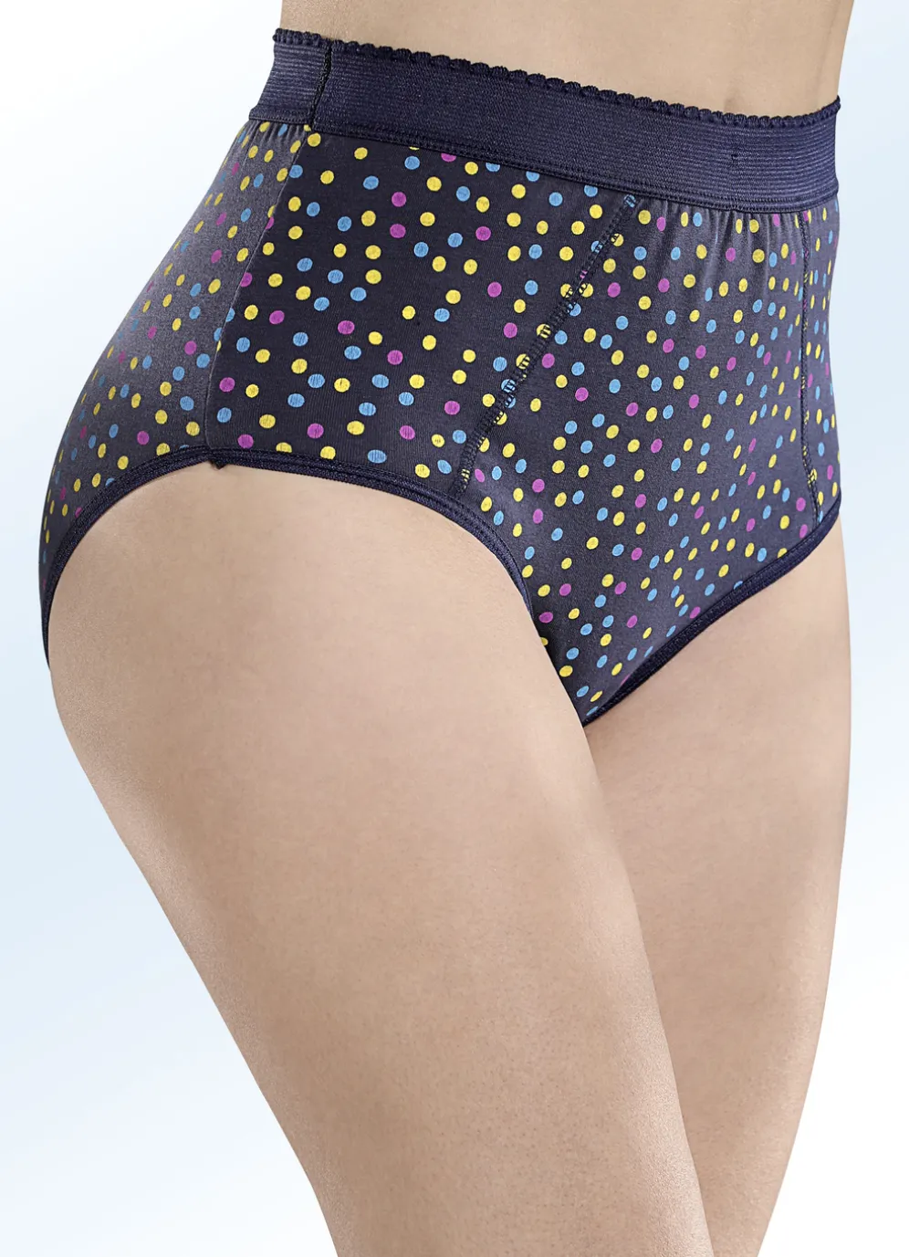 Marinefarbener Formslip mit buntem Punktedessin, verstärkter Bauchpartie sowie bequemem Elastikbund.