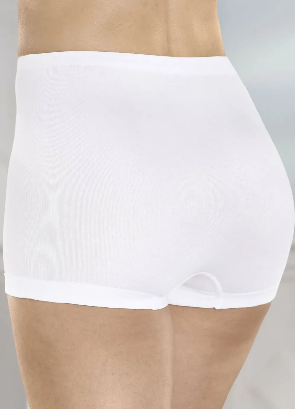 Weißer Schlüpfer mit auswechselbarem Gummizug im Bund. Ohne Seitennähte.