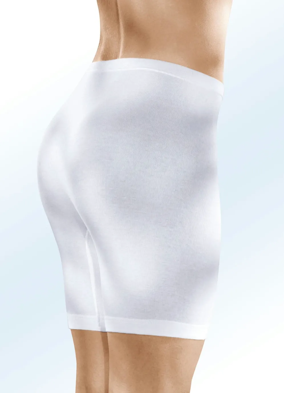Schlüpfer in Weiß, mit auswechselbarem Gummizug im Bund. Ohne Seitennähte.