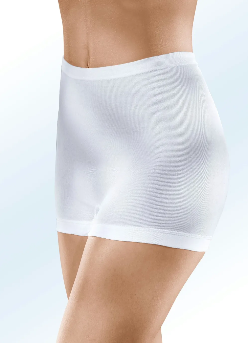 Weißer Schlüpfer mit Gummizug im Bund sowie dauerelastischen Beinabschlüssen. Ohne Seitennähte.
