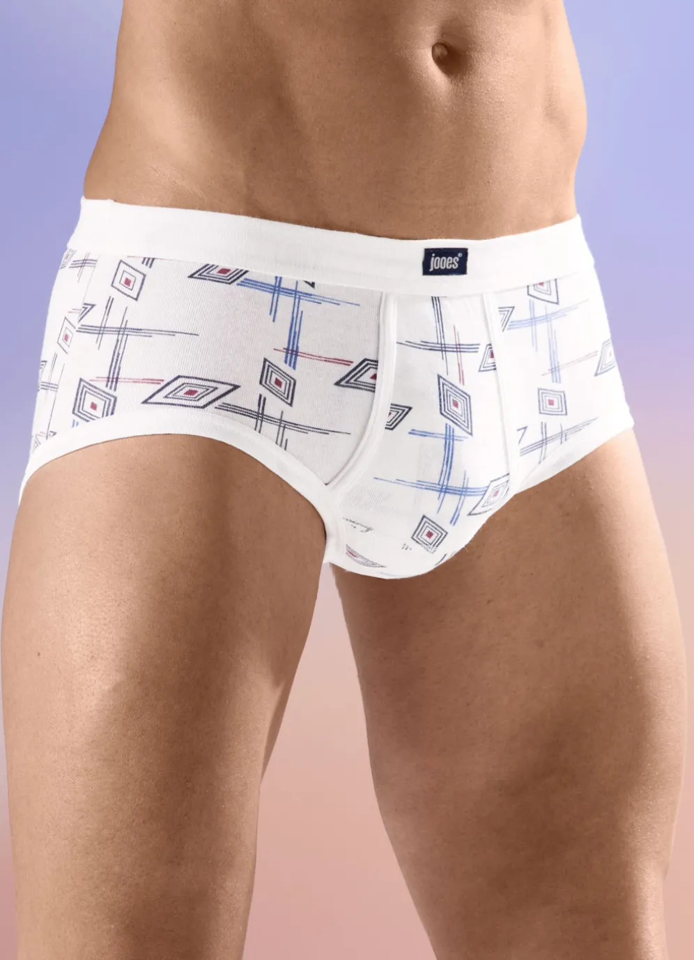 Allover dessinierter Slip mit Label am Softbund, Schrittverstärkung sowie paspeliertem Eingriff.