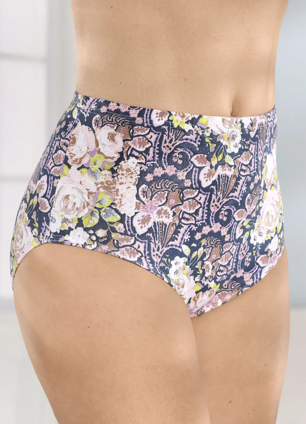 Fünferpack Slips mit buntem Druckdessin in Jeansblau-Rosé-Bunt und in Größe 40.