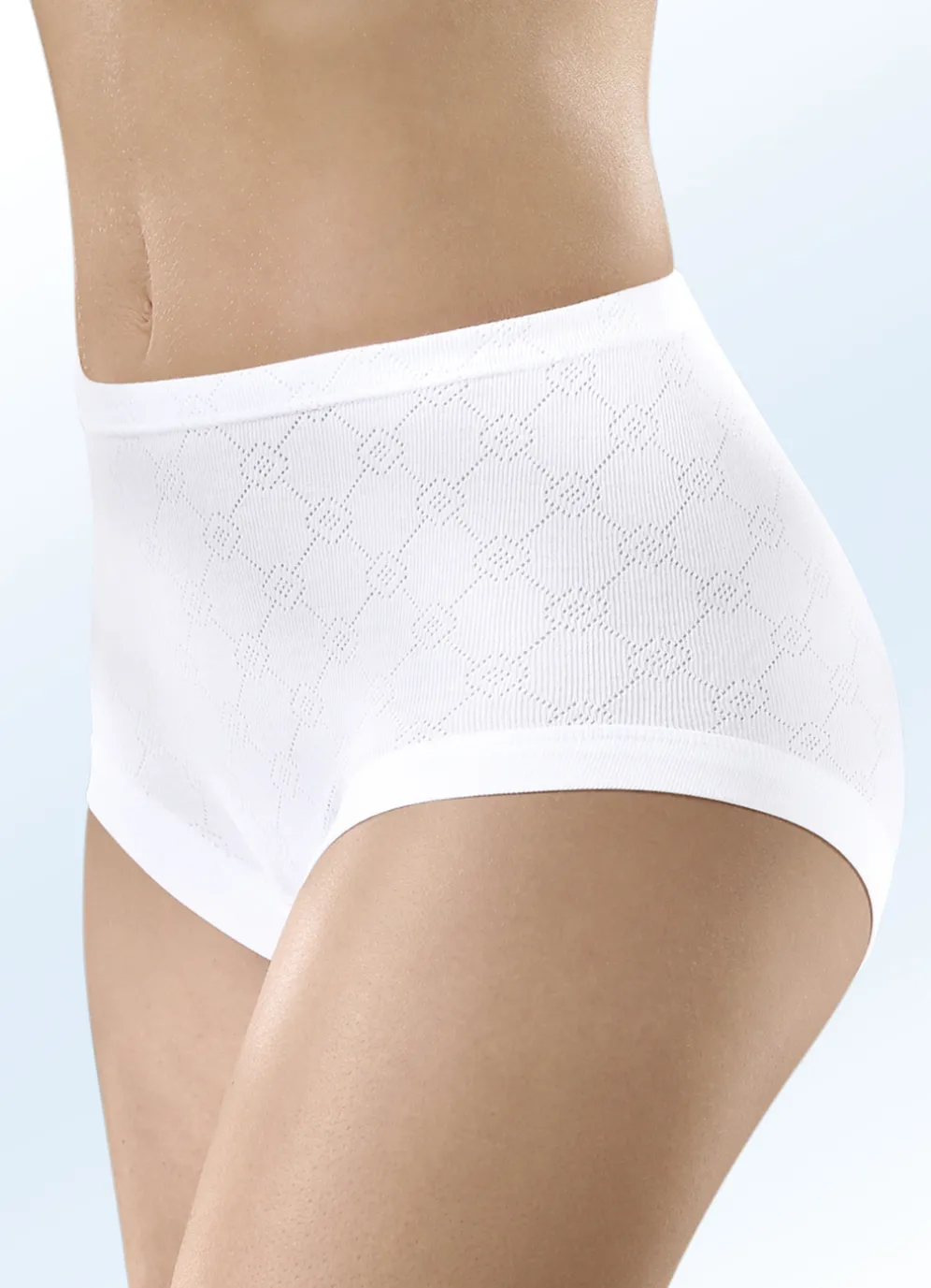 Slip in Weiß, mit Jacquard-Dessin sowie Gummizug im Bund. Ohne Seitennähte.