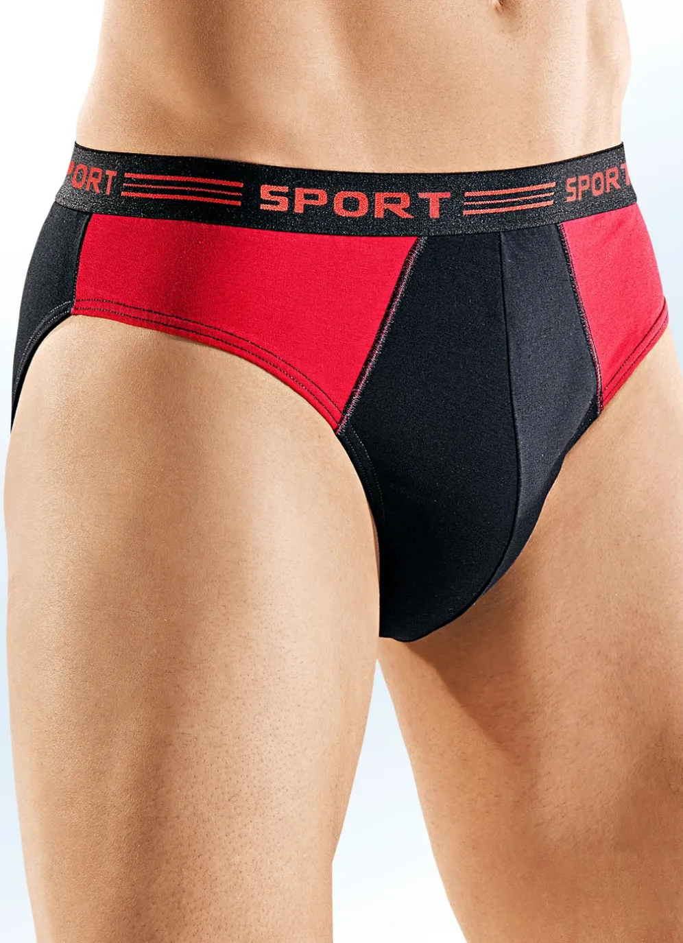 Fünferpack Slips, uni mit Einsätzen in 3X Schwarz-Rot, 2X Schwarz-Royalblau und in Größe 4.