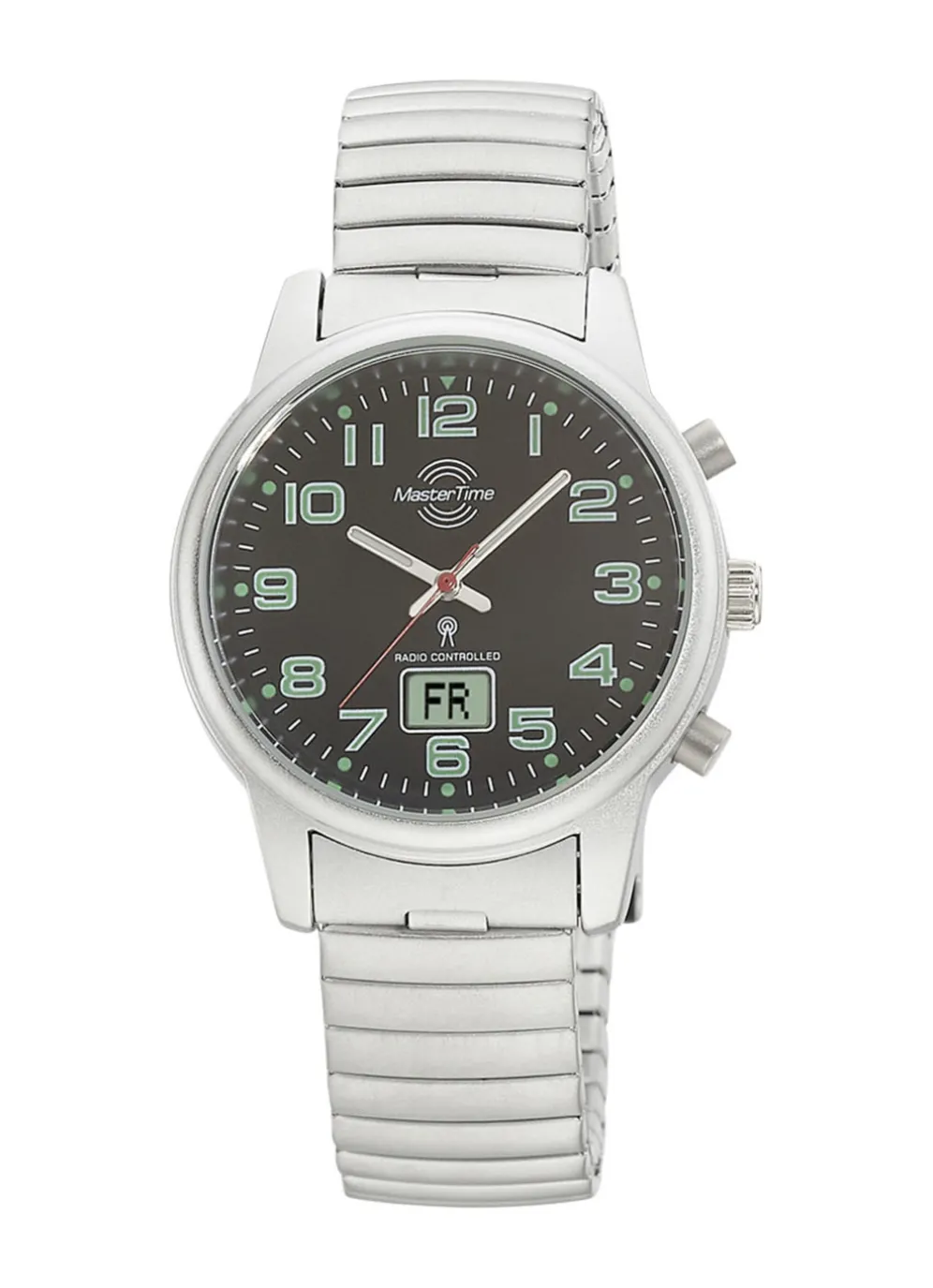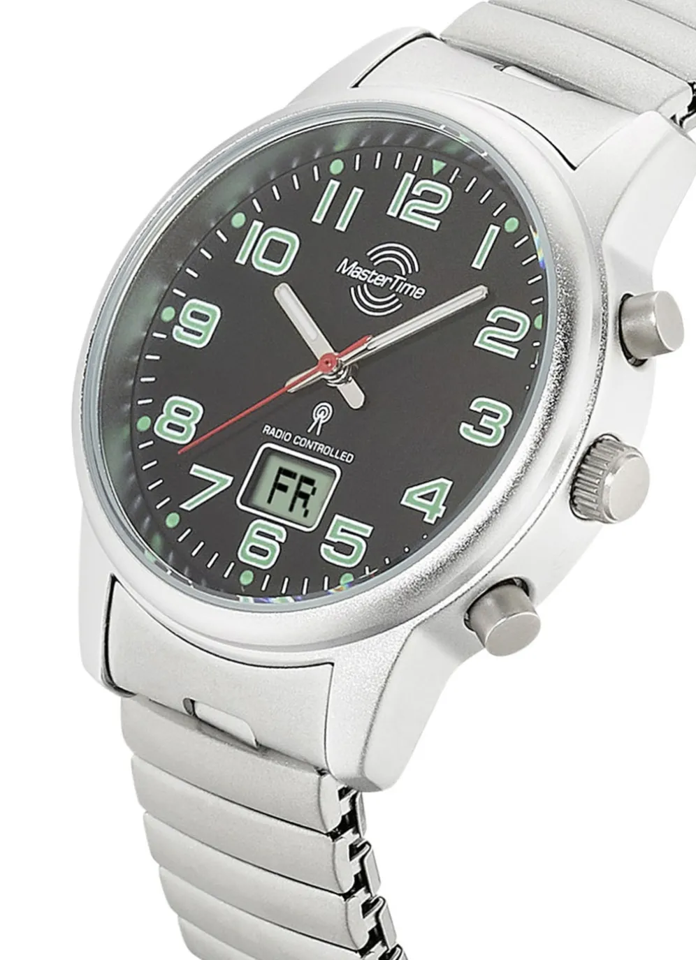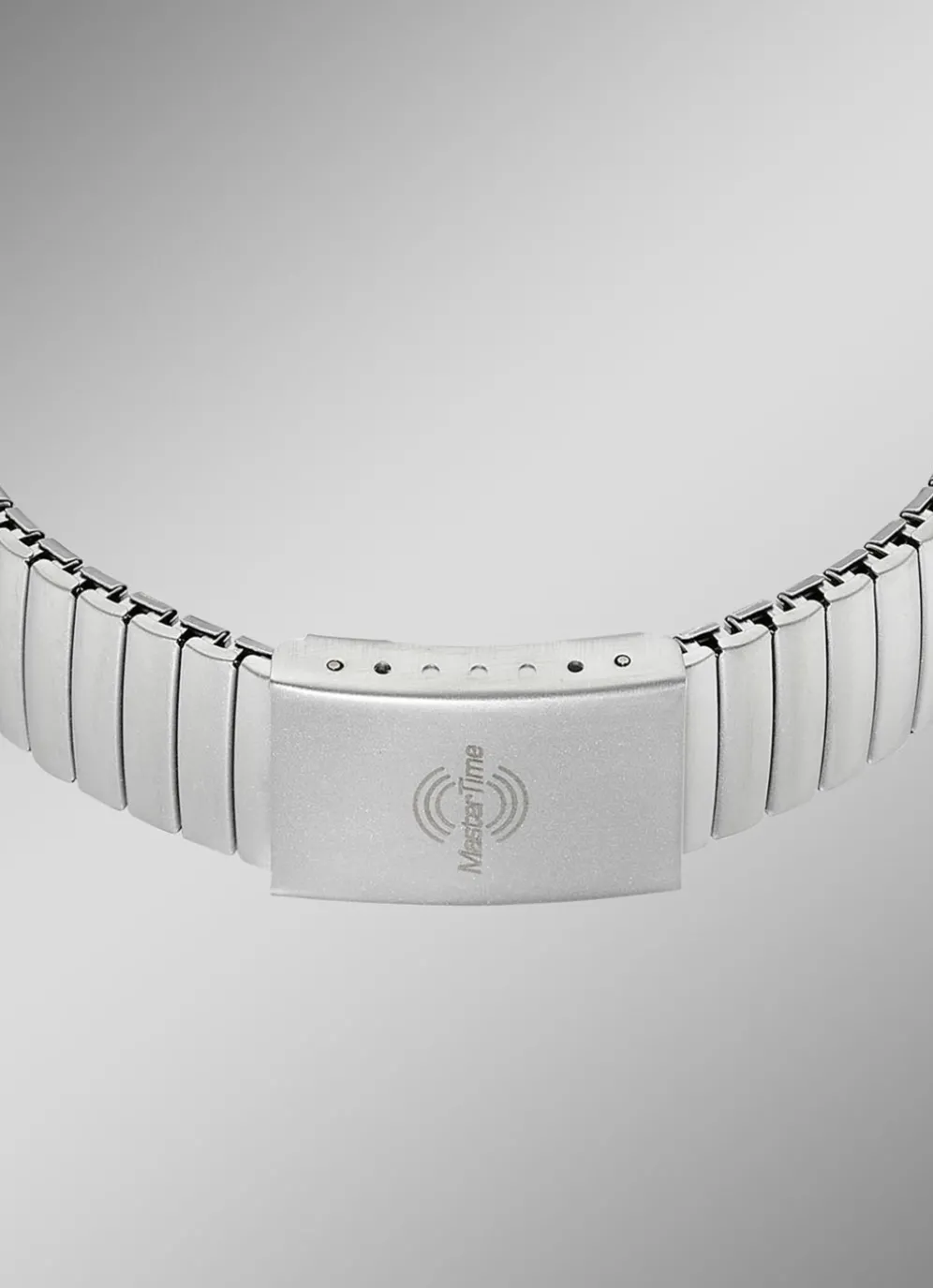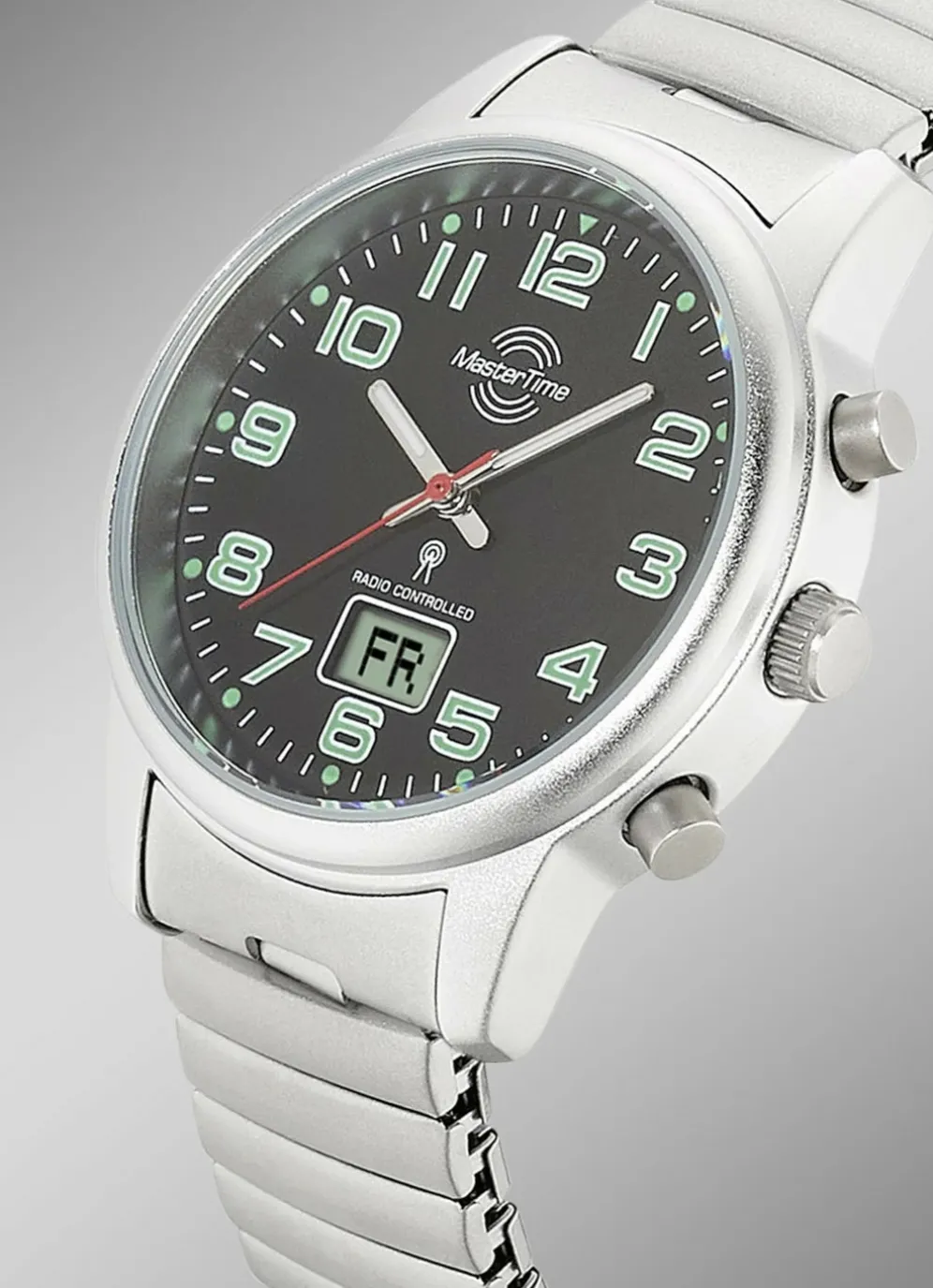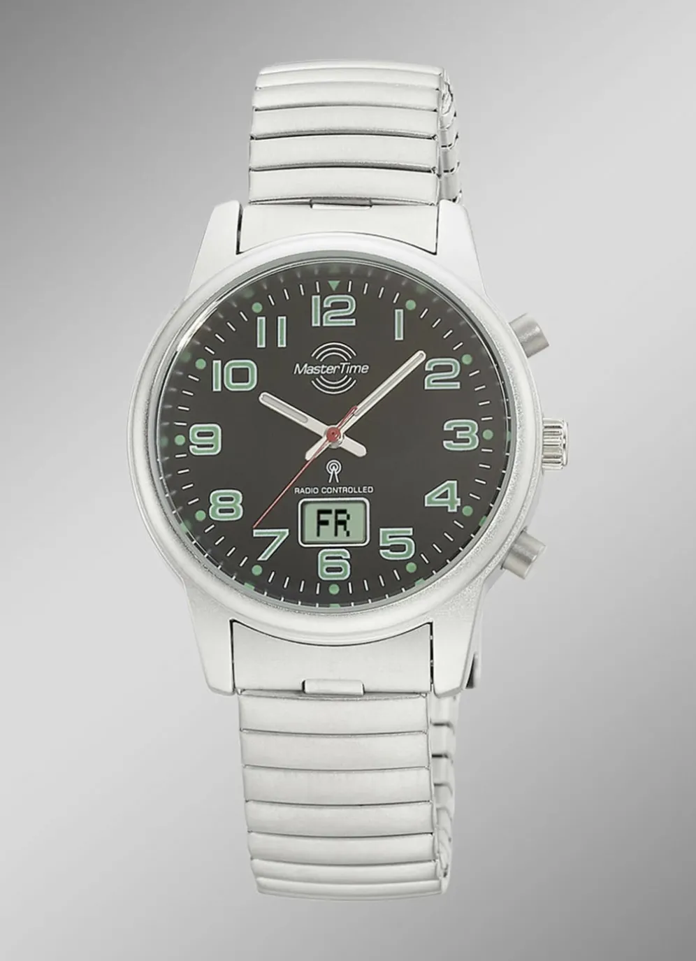 mit einem Metallgehäuse, Edelstahboden, Edelstahlzugband und Mineralglas. Das Zifferblatt dieser Funkuhr ist gut ablesbar und mit Leuchtzeigern versehen. Die Damenuhr ist 3 bar wasserdicht und hat einen Gehäusedurchmesser von 34 mm.