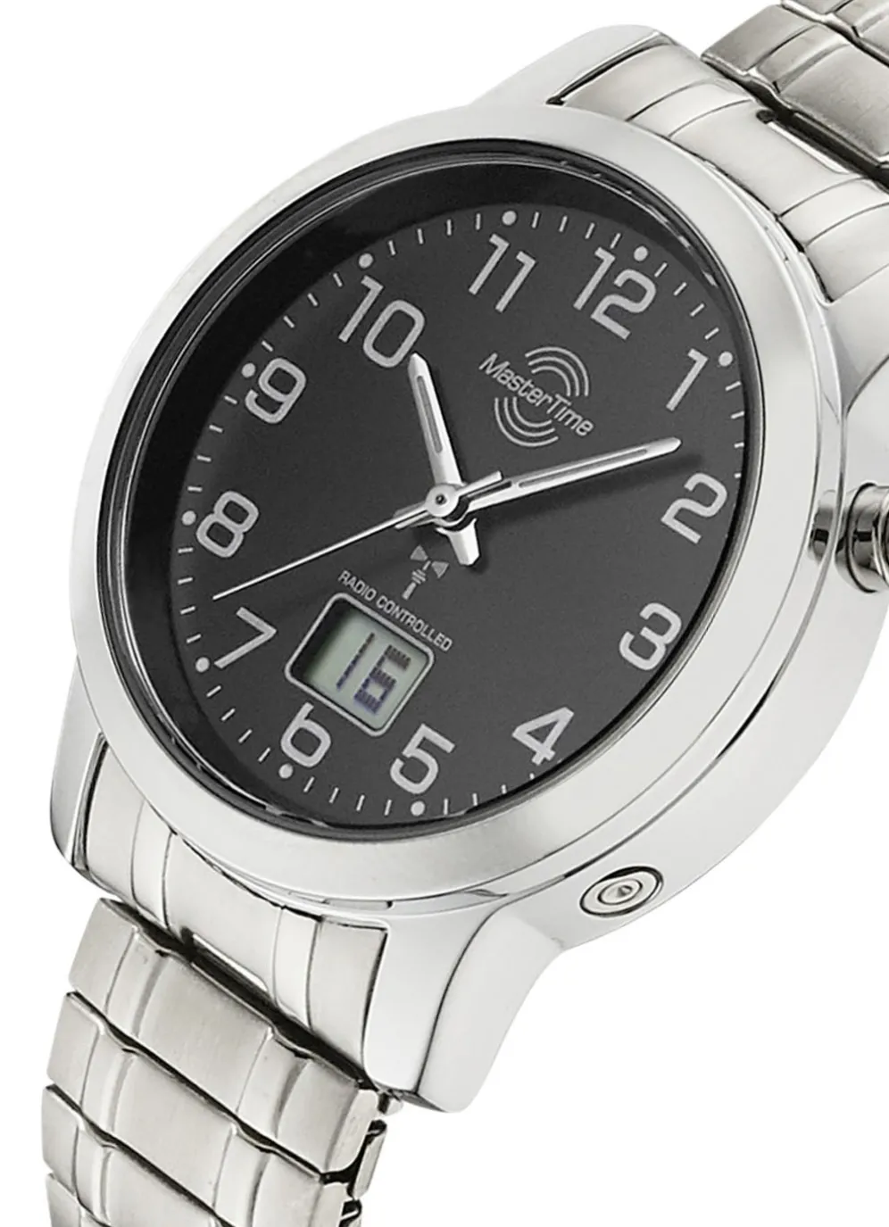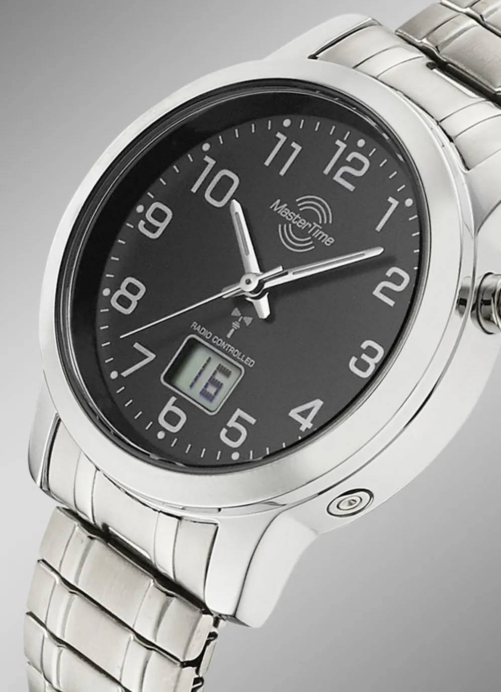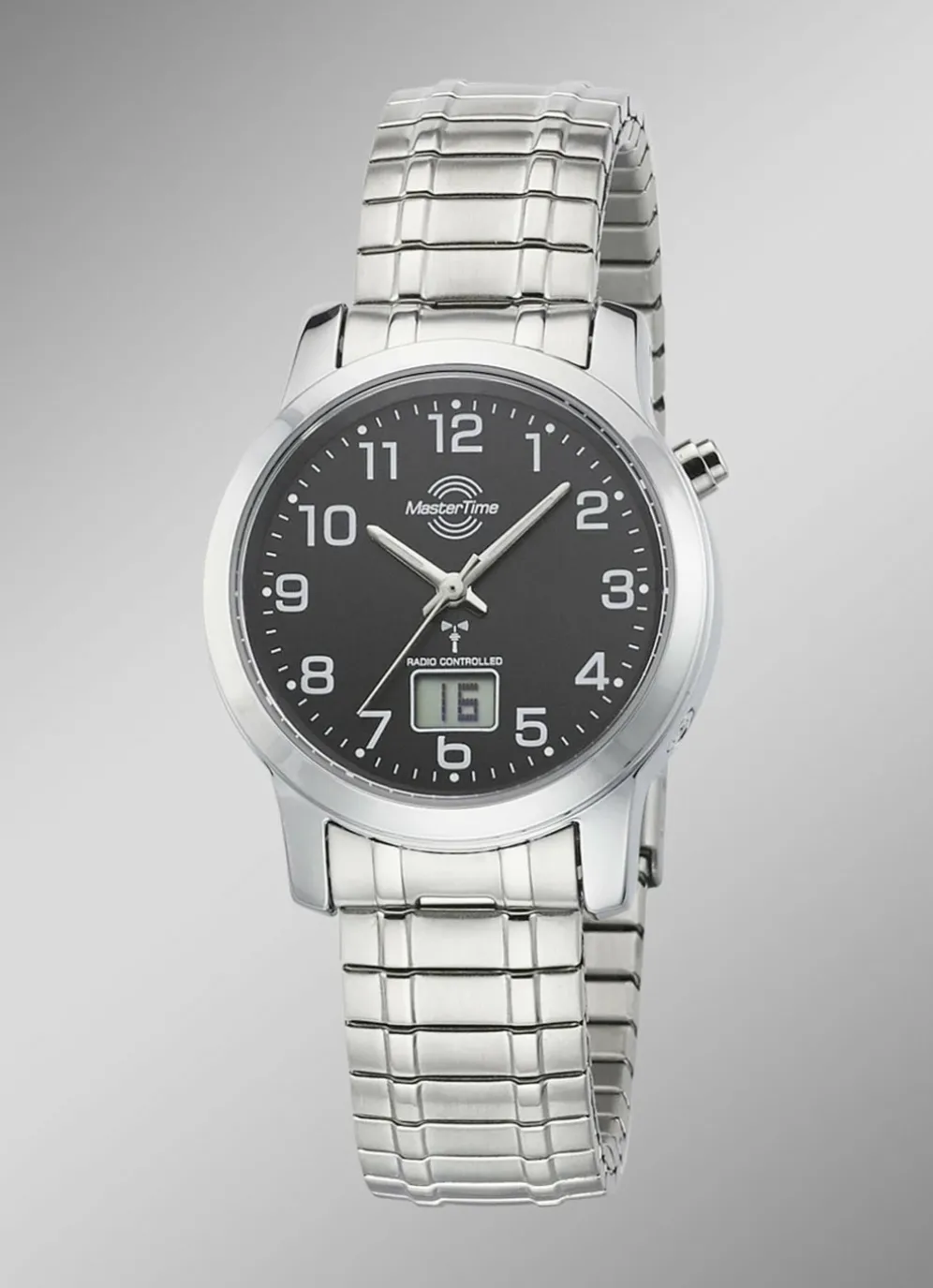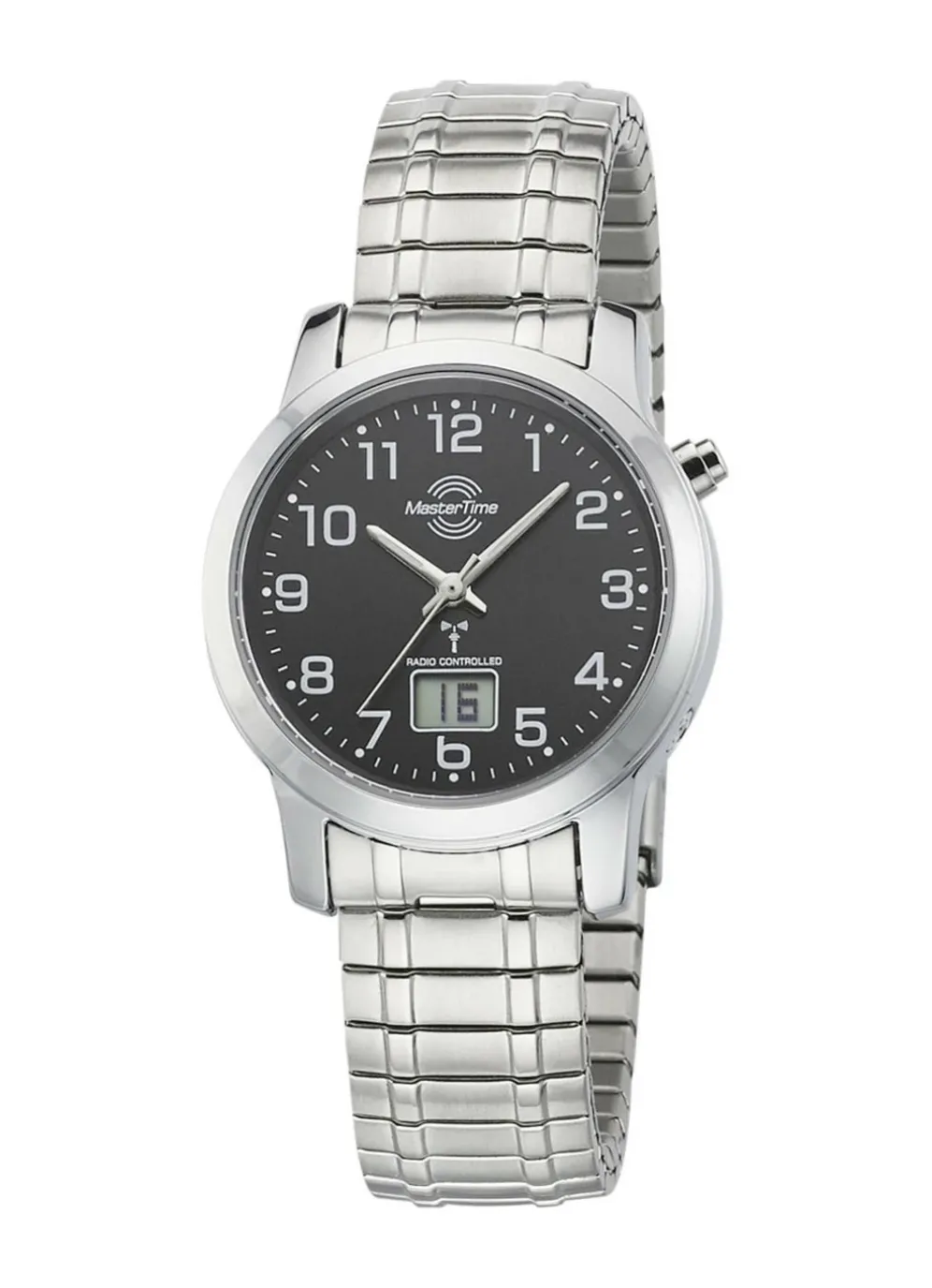 mit einem Metallgehäuse, Edelstahboden, Edelstahlzugband und Mineralglas. Das Zifferblatt dieser Funkuhr ist gut ablesbar und mit Leuchtzeigern versehen. Die Damenuhr ist 3 bar wasserdicht und hat einen Gehäusedurchmesser von 33 mm.