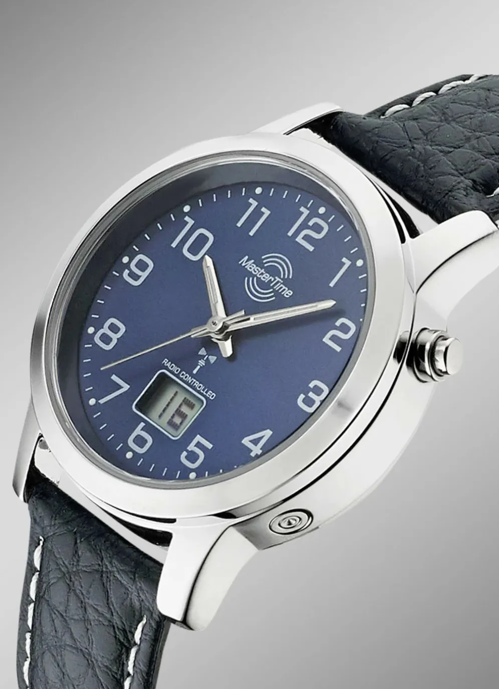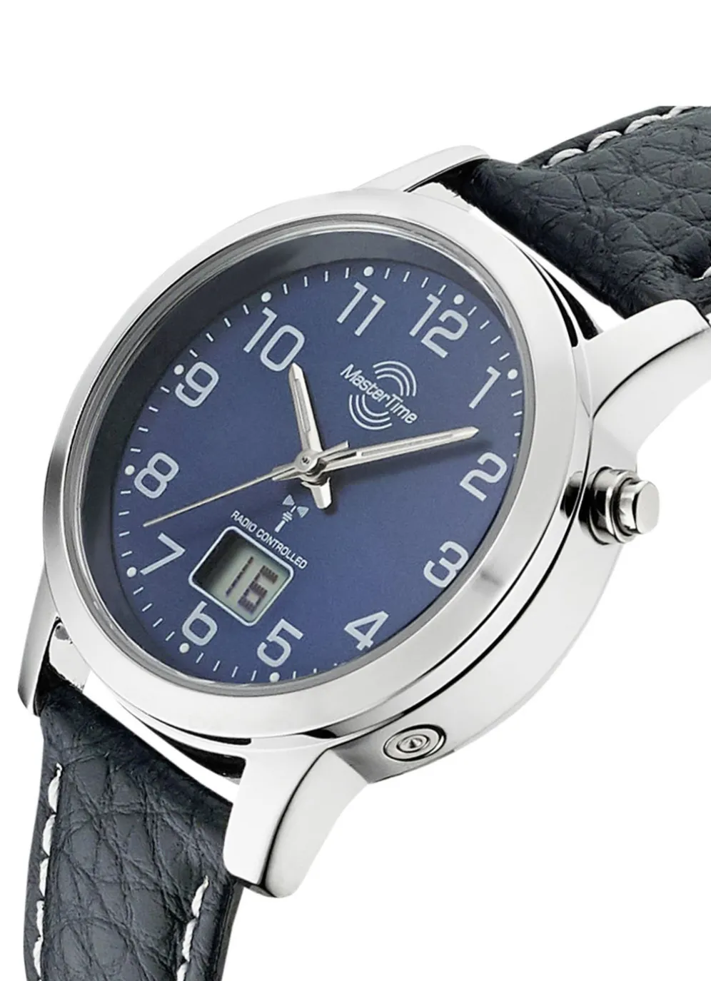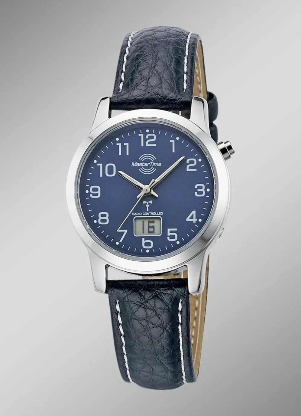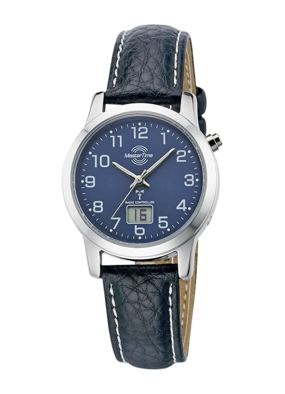 Modische, sportliche Damen-Lederarmbanduhr mit Metallgehäuse und Edelstahlboden. Funkgesteuert, mit Sekunden- Datums- und Tagesanzeige im Digitalfeld. Automatische Umstellung von Sommer- und Winterzeit. Die Uhr ist bis zu 3 Bar wasserdicht und hat einen Gehäusedurchmesser von 33 mm.