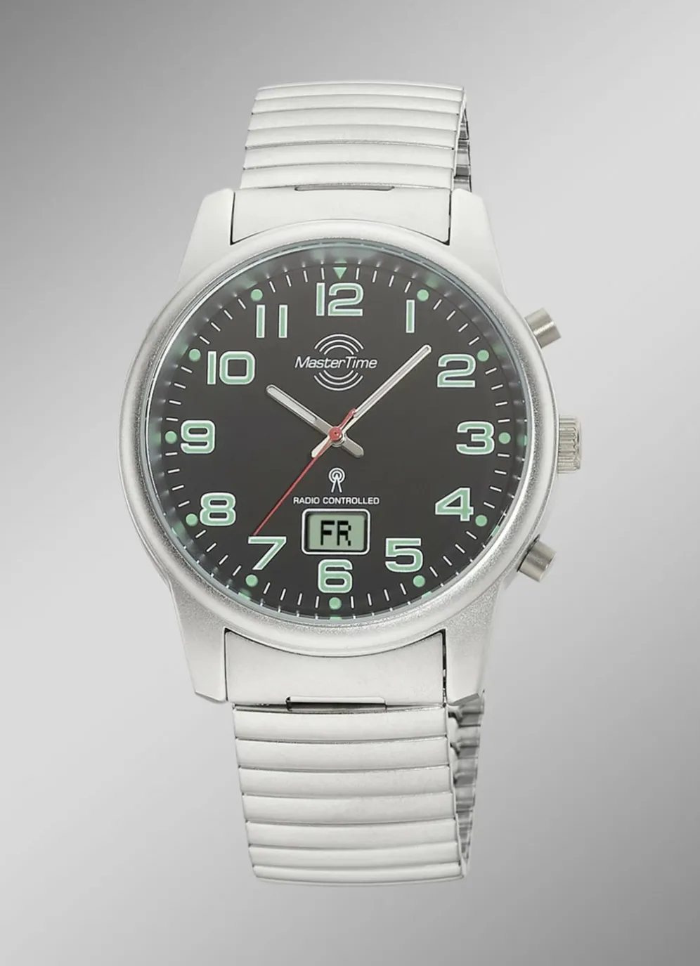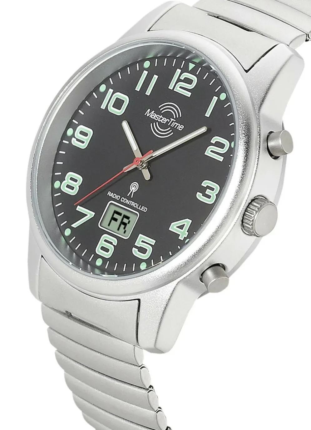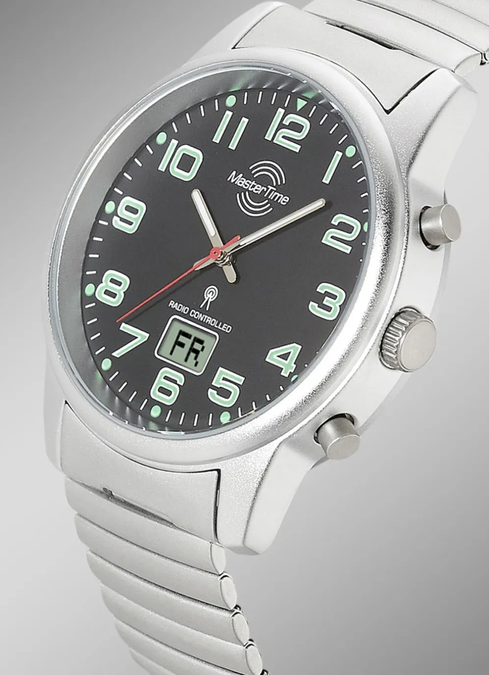mit einem Metallgehäuse, Edelstahboden, Edelstahlzugband und Mineralglas. Das Zifferblatt dieser Funkuhr ist gut ablesbar und mit Leuchtzeigern versehen. Die Herrenuhr ist 3 bar wasserdicht und hat einen Gehäusedurchmesser von 41 mm.