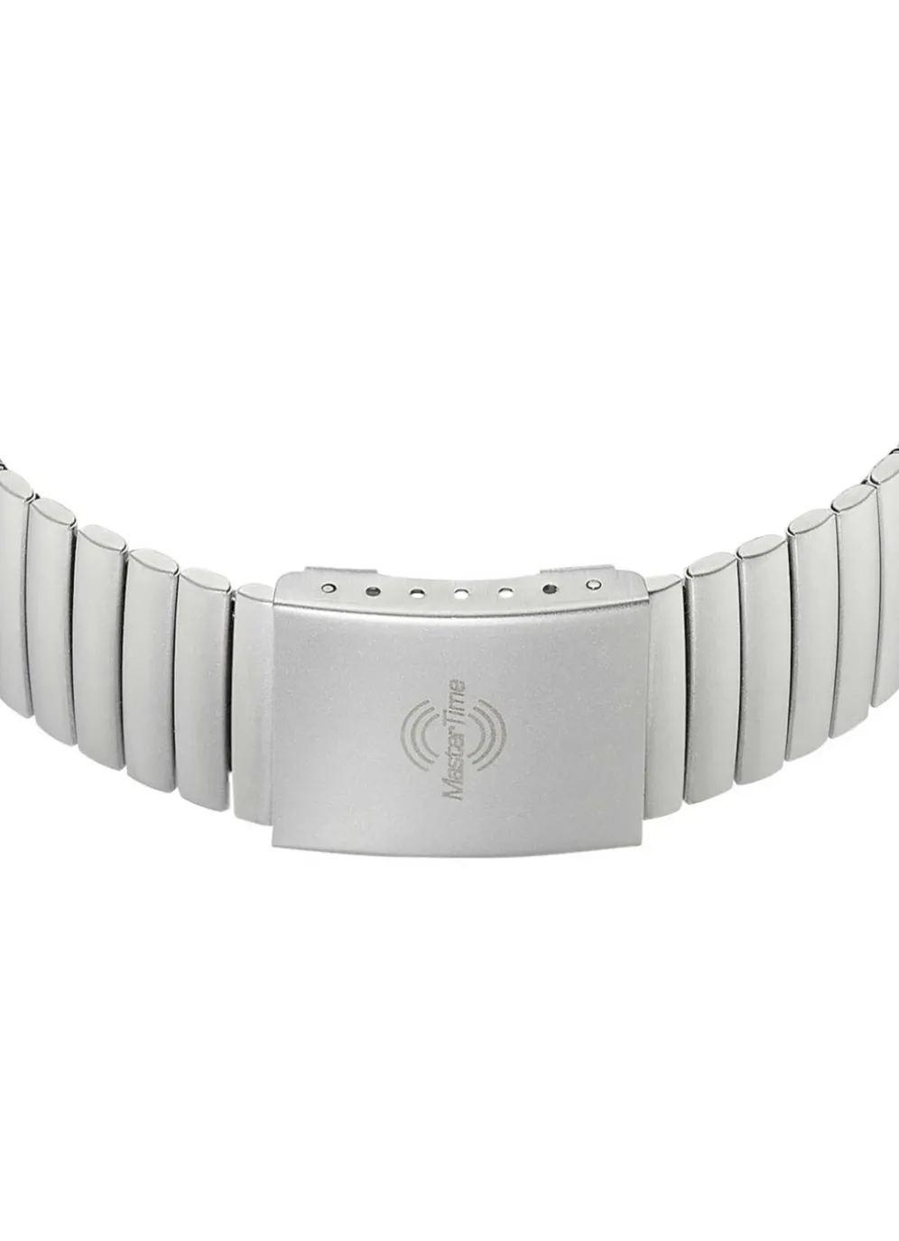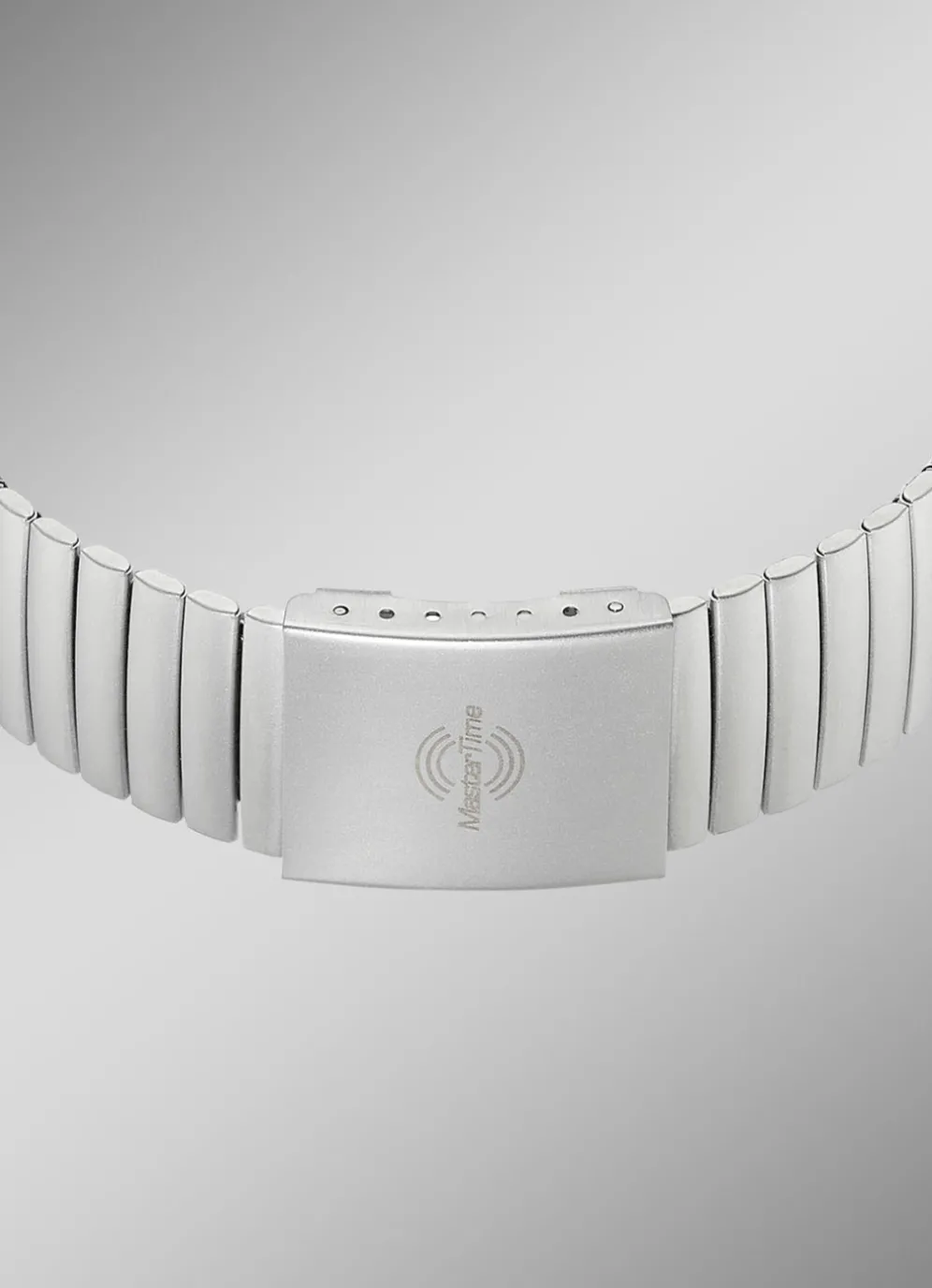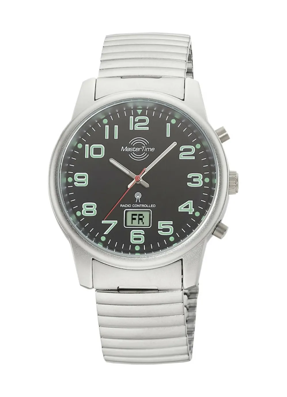 mit einem Metallgehäuse, Edelstahboden, Edelstahlzugband und Mineralglas. Das Zifferblatt dieser Funkuhr ist gut ablesbar und mit Leuchtzeigern versehen. Die Herrenuhr ist 3 bar wasserdicht und hat einen Gehäusedurchmesser von 41 mm.