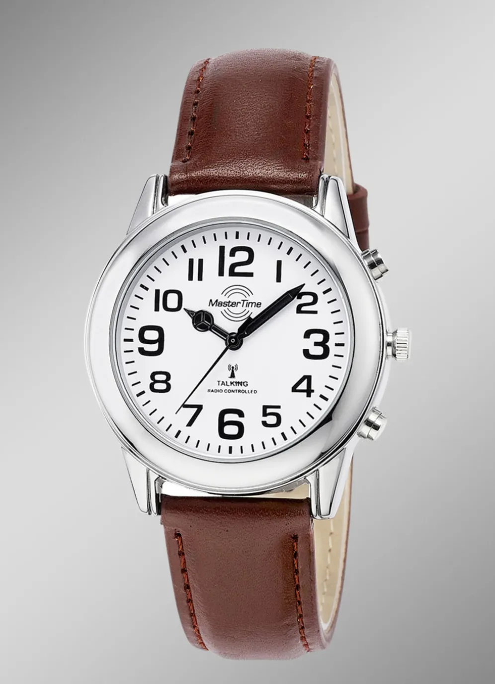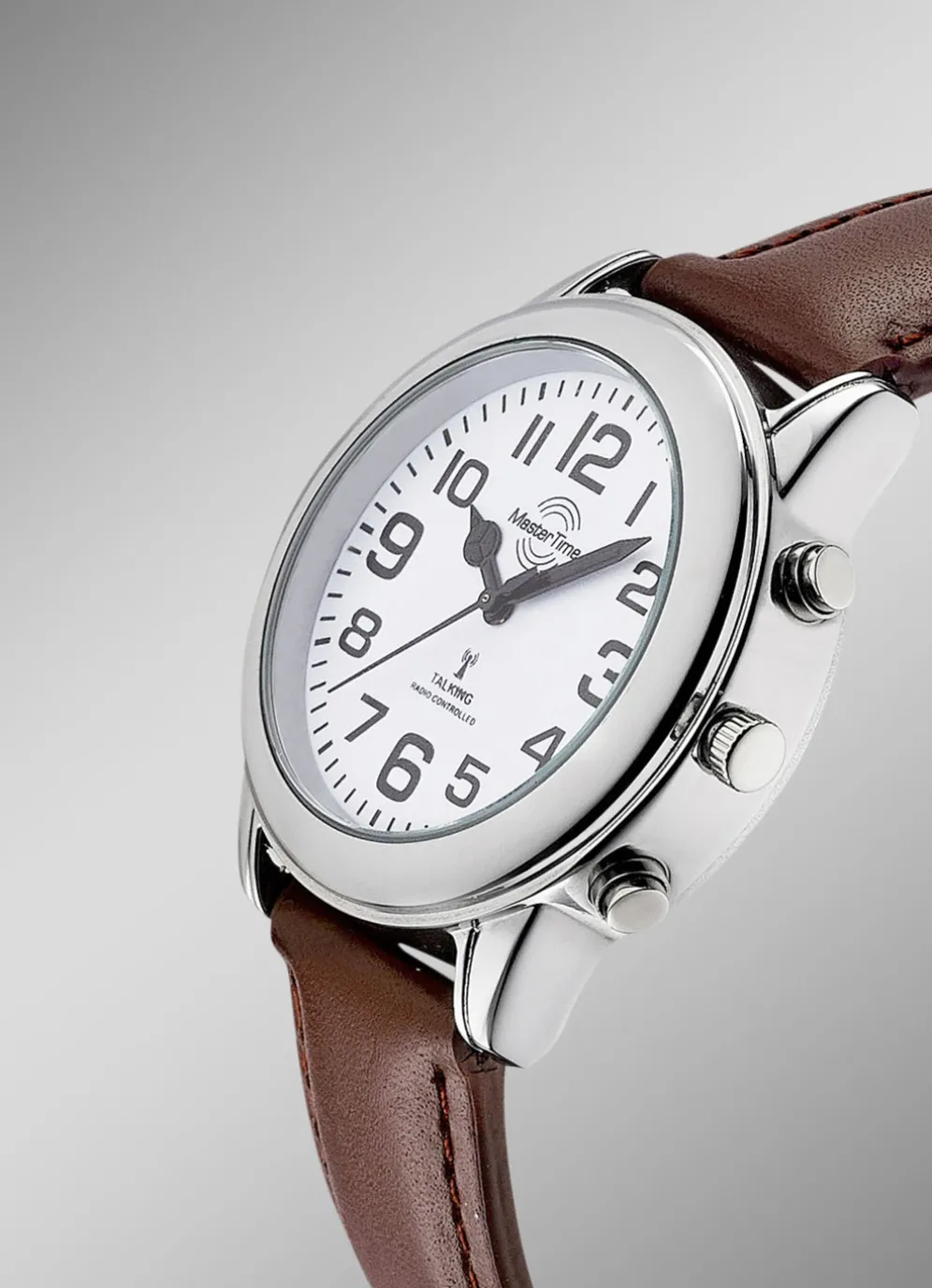 Funk-Herrenuhr mit Lederband und sprechender Zeitansage