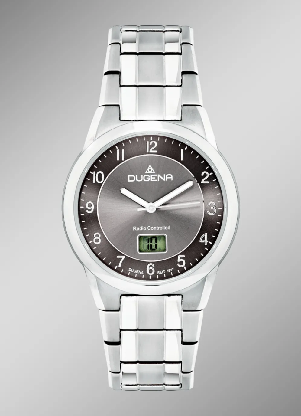 Dugena Gent Funk 4460836. Klassische Funk-Herrenuhr mit Titangehäuse und Titanband mit Faltschließe. Zudem hat die Herrenuhr ein Saphirglas und eine digitale Datums-Anzeige. Sie ist 5 bar wasserdicht und hat einen Gehäusedurchmesser von 39 mm.