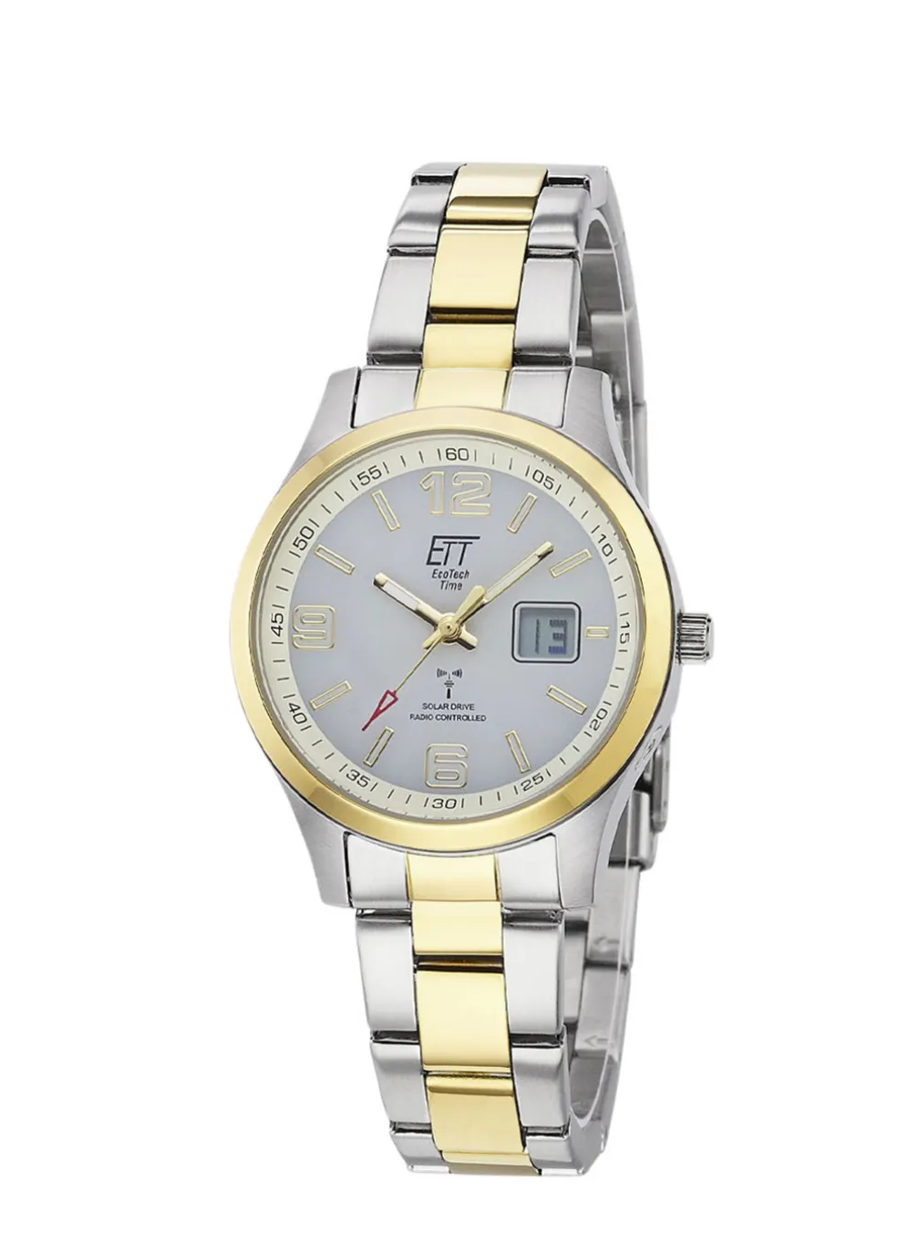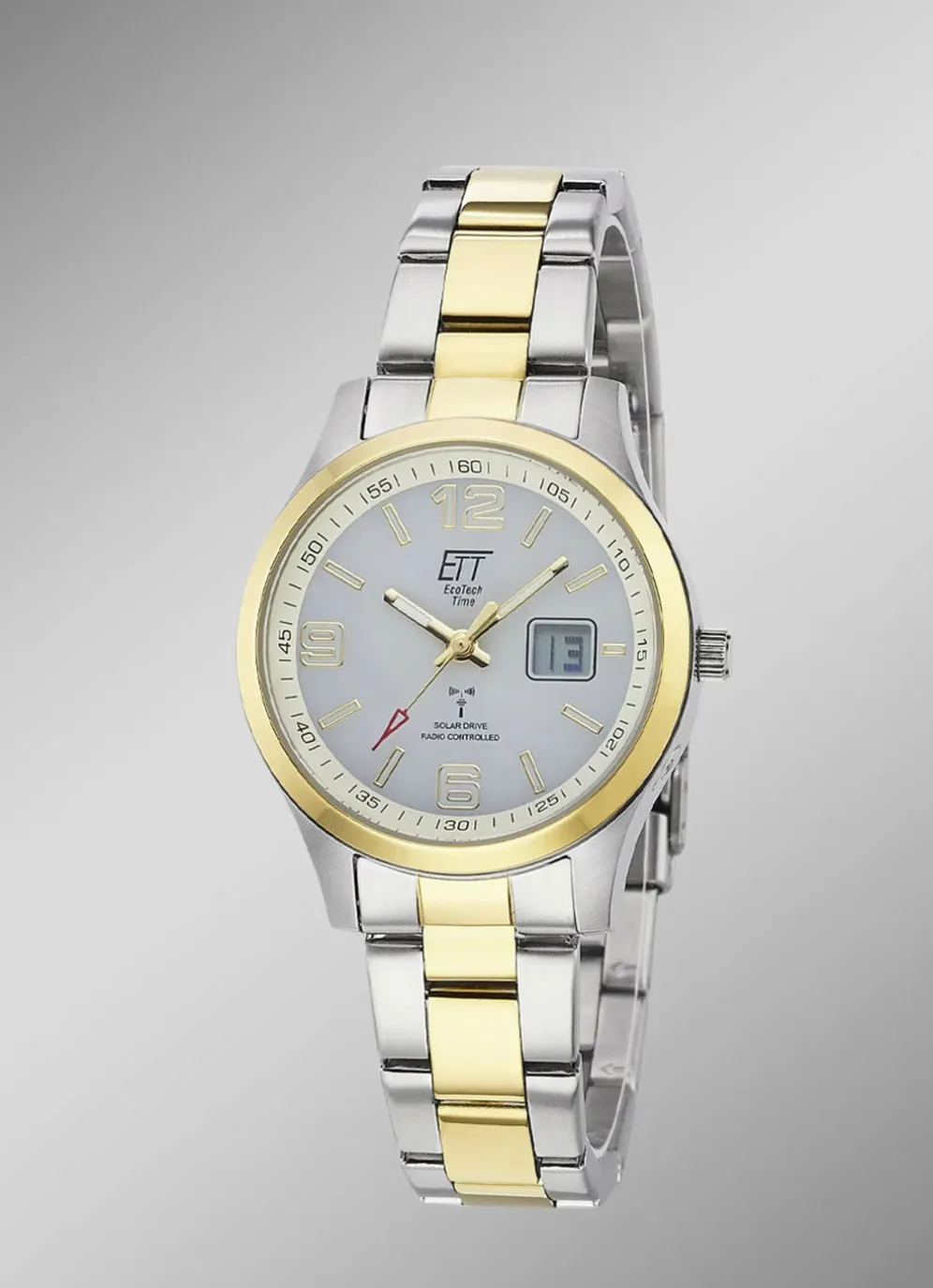 Diese Damenuhr ist ein sportlicher Alltagsbegleiter und bis zu 10 Bar wasserdicht. Die Solar Funk Uhr bietet ein Edelstahlgehäuse und -armband mit Sicherheitsschließe. Dank des zuverlässigen Solar Funk Uhrwerks müssen keine Batterien mehr gewechselt werden. Zudem wird stets die exakte Uhrzeit angezeigt. Eine Besonderheit ist die digitale Datums-, Wochentags- und Ladezustandsanzeige.
