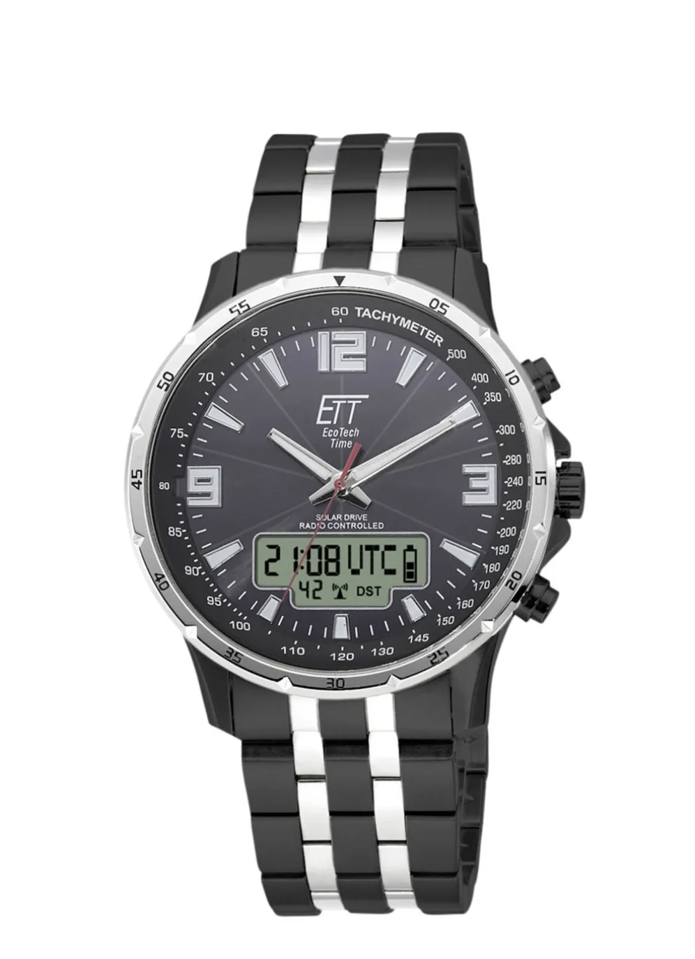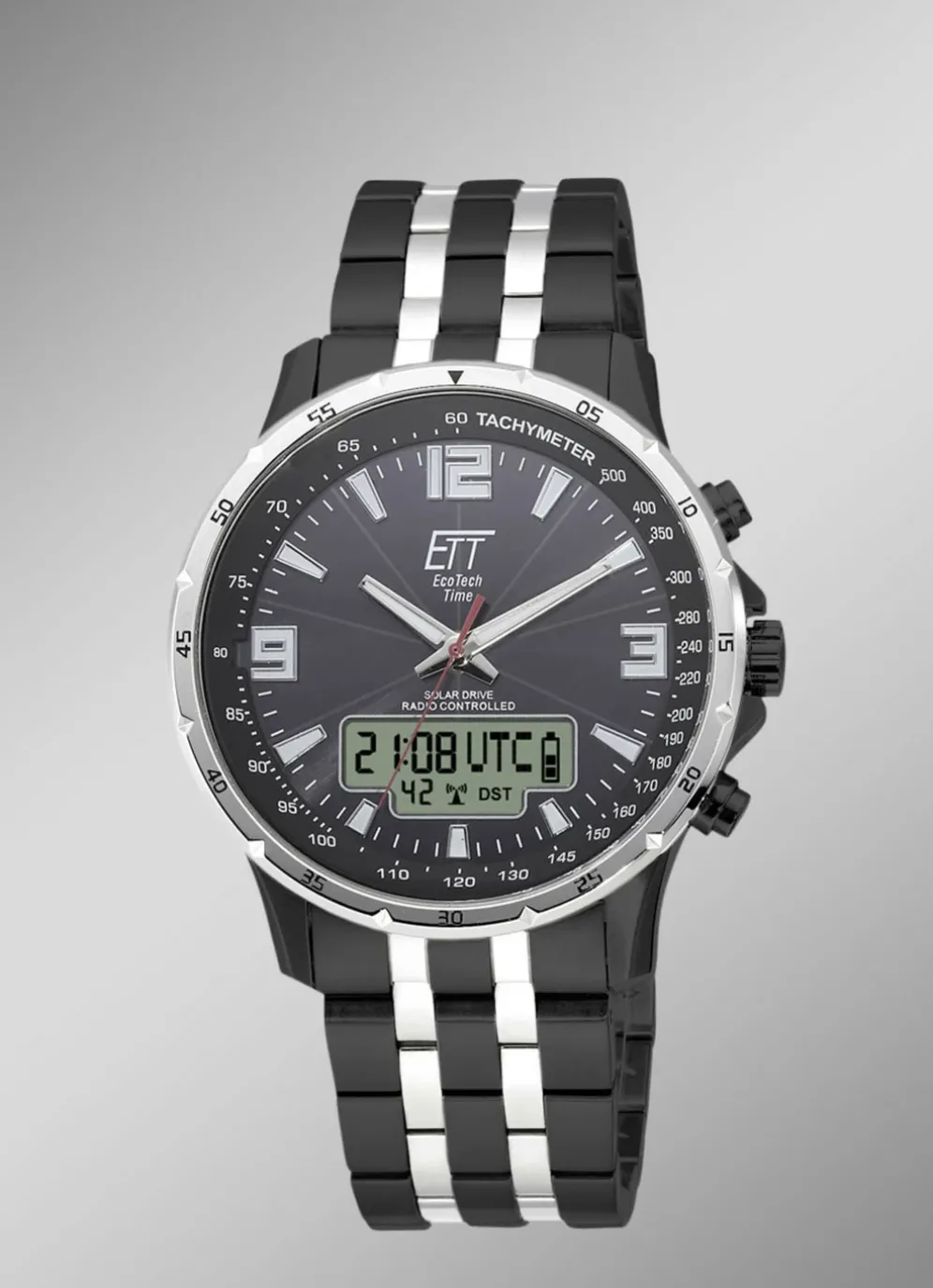 Sportliche, elegante Herrenuhr, funkgesteuert und mit Solar Antrieb. Das Gehäuse und Armband sind aus robustem, massivem Edelstahl. Die Zifferblattfarbe ist schwarz. Diese Multifunktionsuhr besitzt unter anderem eine World Timer Funktion, mit abrufbaren Uhrzeiten von 38 internationalen Städten. Die Datumsanzeige ist sehr gut ablesbar (Big Date mit Tag / Wochentag), dass Zifferblatt ist durch Knopfdruck beleuchtbar. Wasserdicht ist die Uhr bis 10 bar.