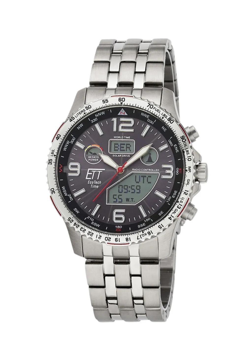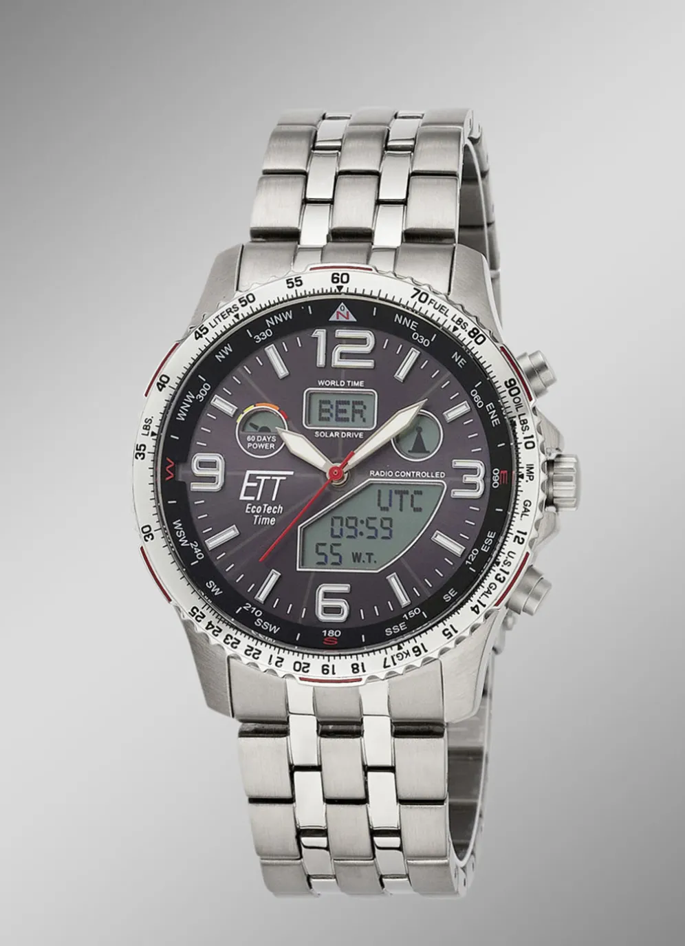 Diese Professional Herrenuhr besticht durch ihr sportliches, aktuelles Design. Sie ist ausgestattet mit einem schwarzen Zifferblatt. Die Uhr aus der Serie Professional bietet viele Funktionen, wie z.B. World Timer für 38 internationale Städte, Chronograph, Datums- und Tagesanzeige, Lichtfunktion und Ladezustandsanzeige. Das Gehäuse und das Armband sind aus Titan gefertigt, dadurch sehr leicht und widerstandsfähig. Wasserdicht ist die Uhr bis zu 10 Bar. Dank des Solarantriebes, (aus Licht wird Energie), ist die Herrenuhr sehr umweltfreundlich.
