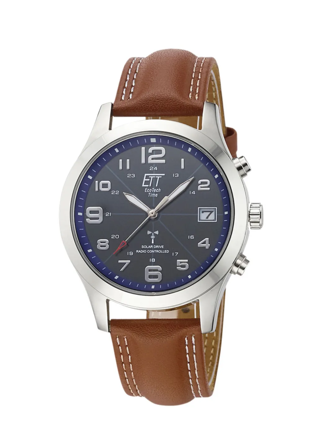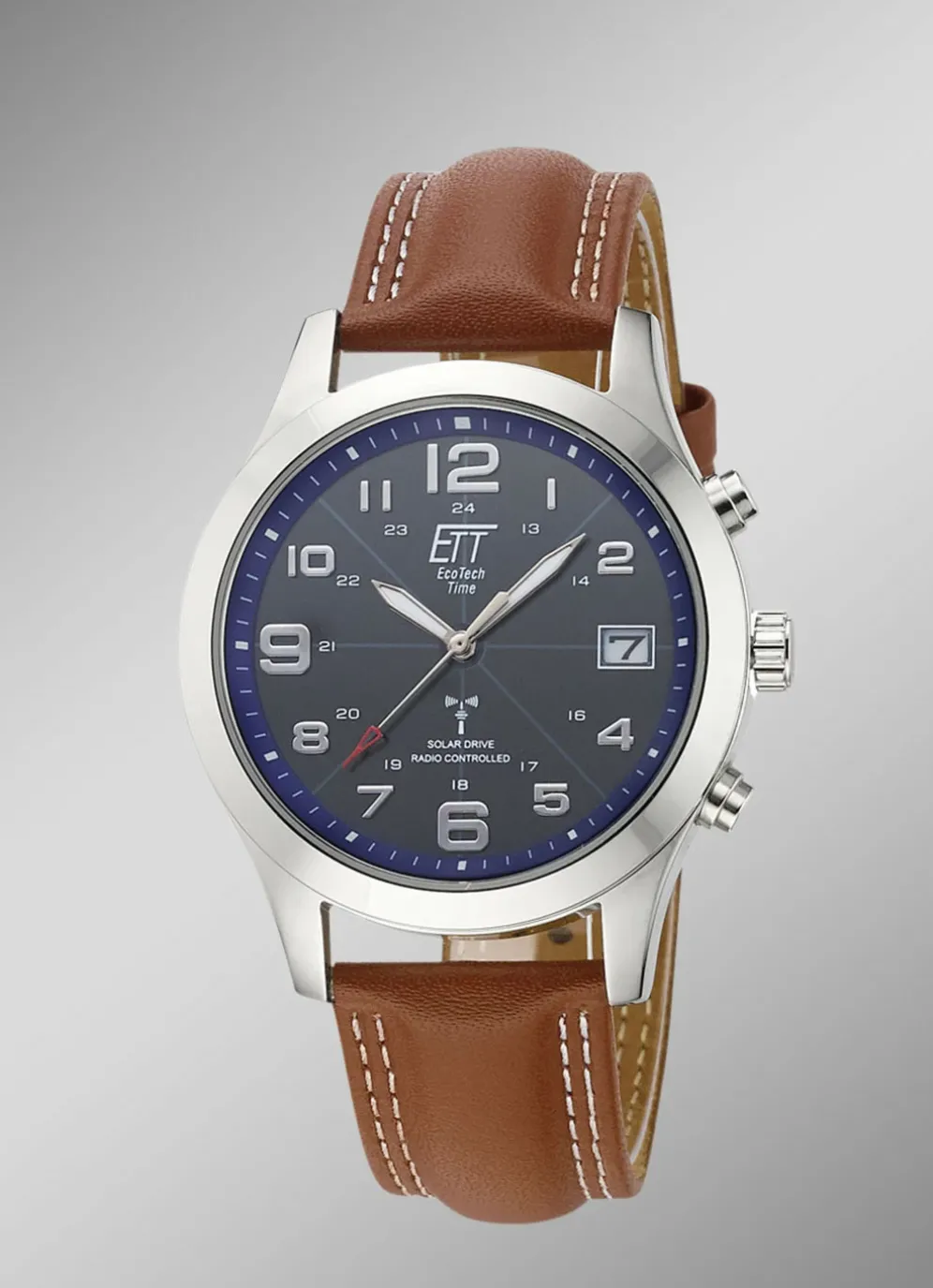 Diese Herrenuhr besticht durch ein sportliches Design, gepaart mit neuster Solar Funk Technologie. Sie müssen nie wieder Batterien wechseln, die Uhrzeit und das Datum werden stets exakt angezeigt. Die Solar Drive Herrenuhr hat ein blaues Zifferblatt, verfügt über eine analoge Datumanzeige und ist wasserdicht bis zu 5 bar. Das Uhrenarmband ist braun und aus Leder.