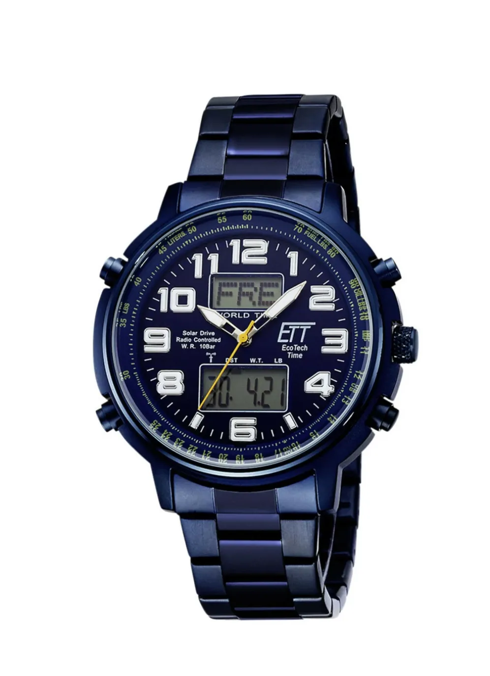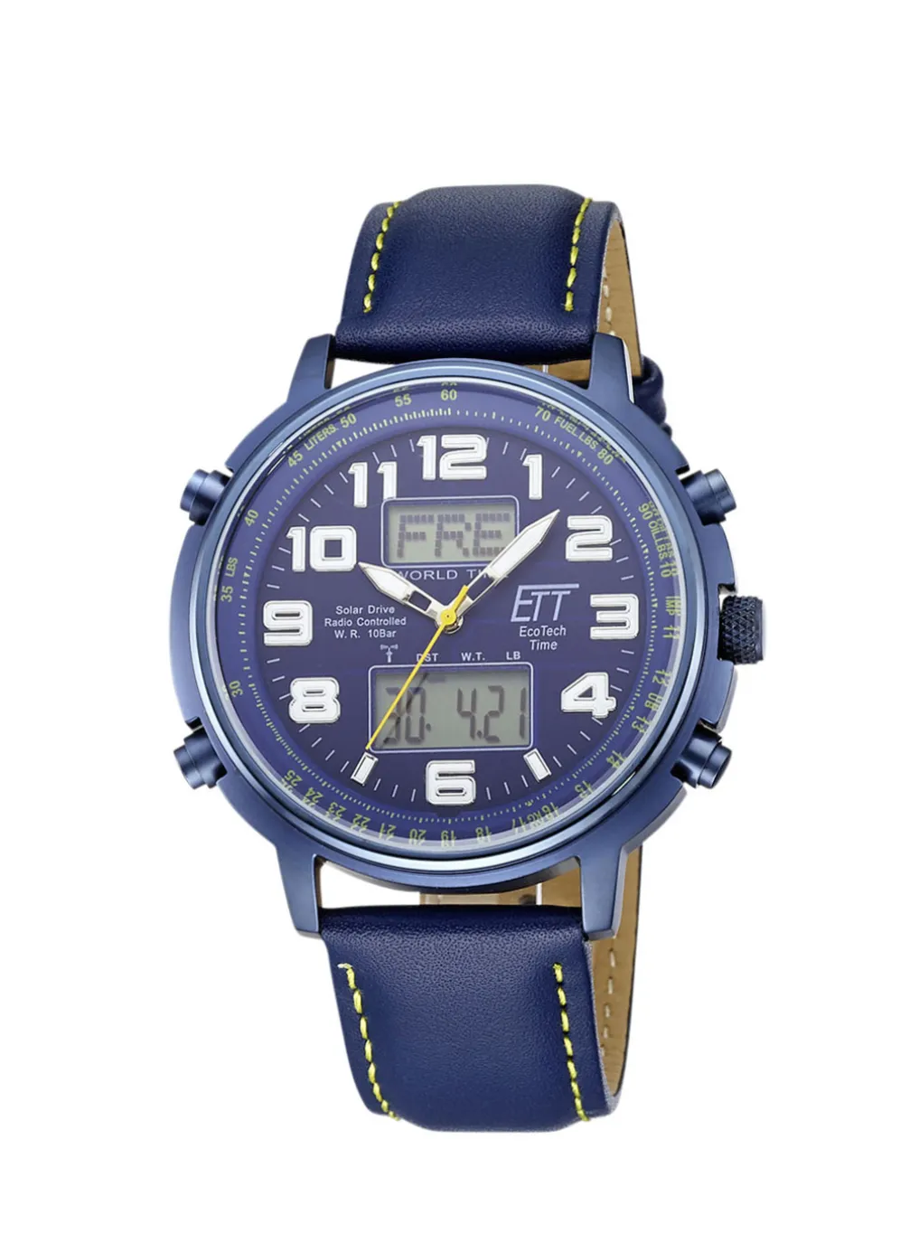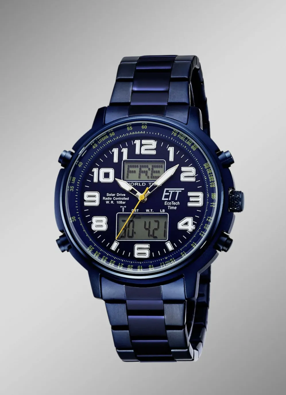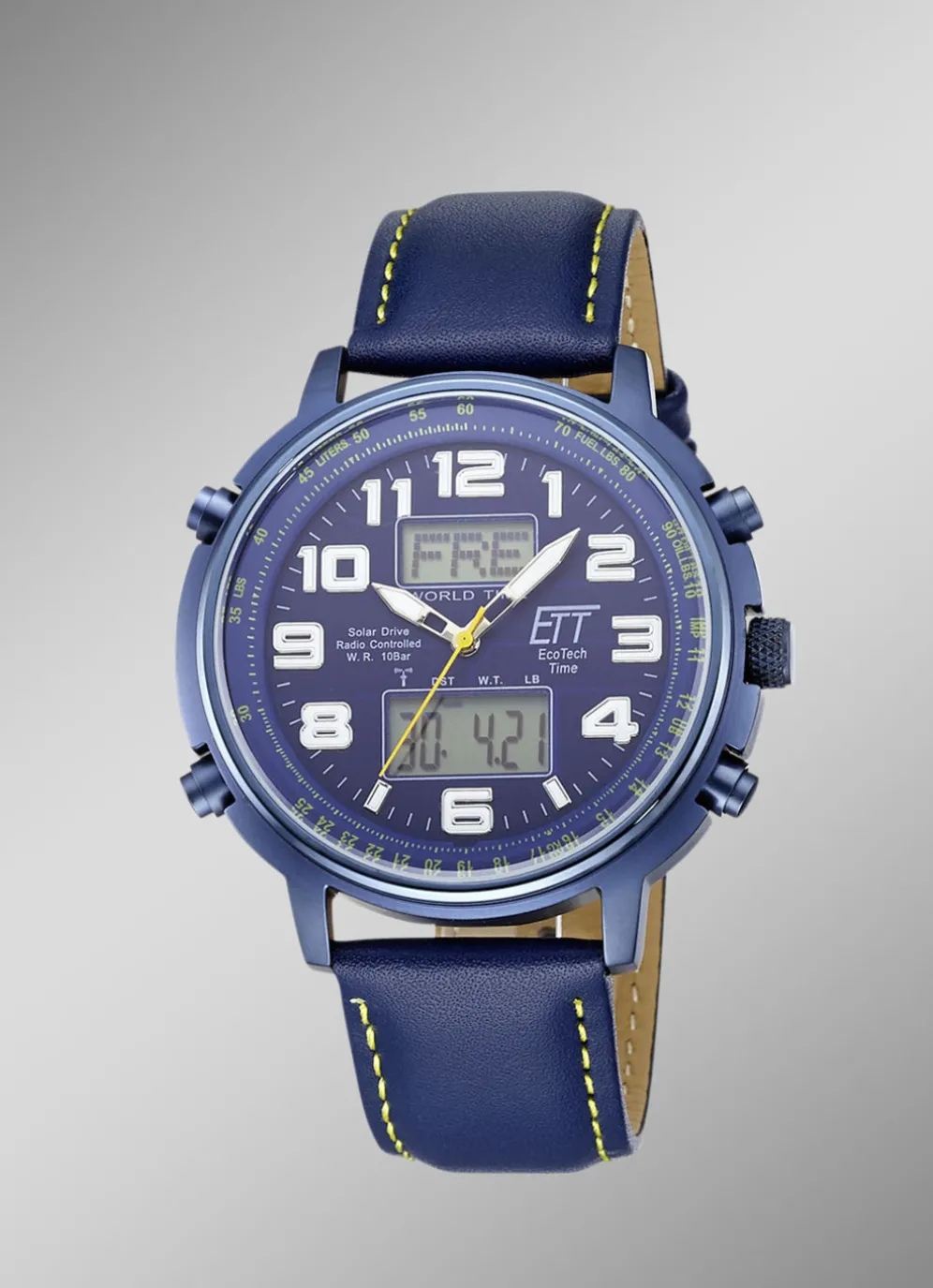 Sportliche ETT-Funk-Solar-Herrenuhr mit Edelstahlgehäuse im Titanlook und Mineralglas. Die Uhr verfügt über folgende Funktionen: Datum, Wochentag, Stoppuhr, und Weltzeitfunktion. Die Herrenuhr ist 10 bar wasserdicht und hat einen Gehäusedurchmesser von 48 mm. Die Uhr gibt es wahlweise mit einem Edelstahlband mit Faltschließe oder einem Lederband mit Dornschließe.