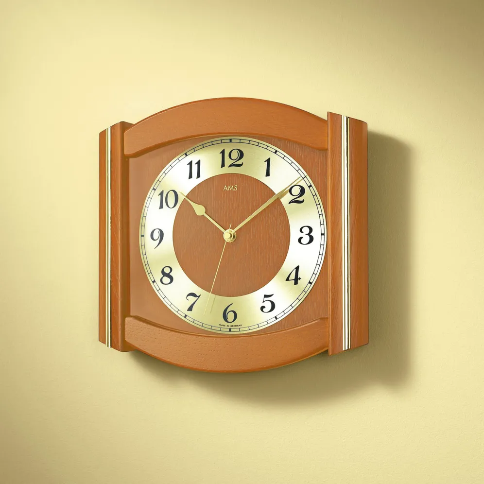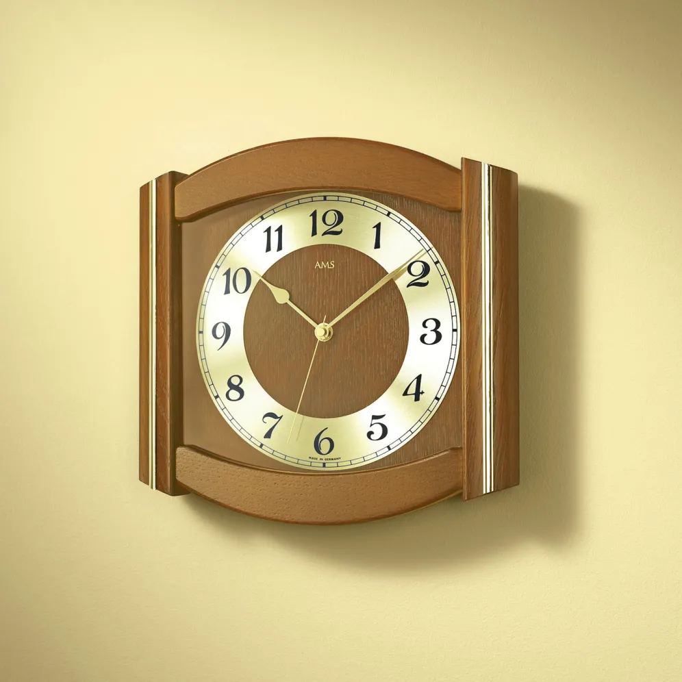 Klassische Wanduhr aus massivem Holz mit messingfarbenen Applikationen. Zahlenreif aus Messing mit großen, arabischen Ziffern, messingfarbenen Zeigern sowie Mineralglasabdeckung. Mit hochwertigem Funkuhrwerk. Batteriebetrieben mit 1x 1,5 Volt Mignon (nicht im Lieferumfang enthalten).