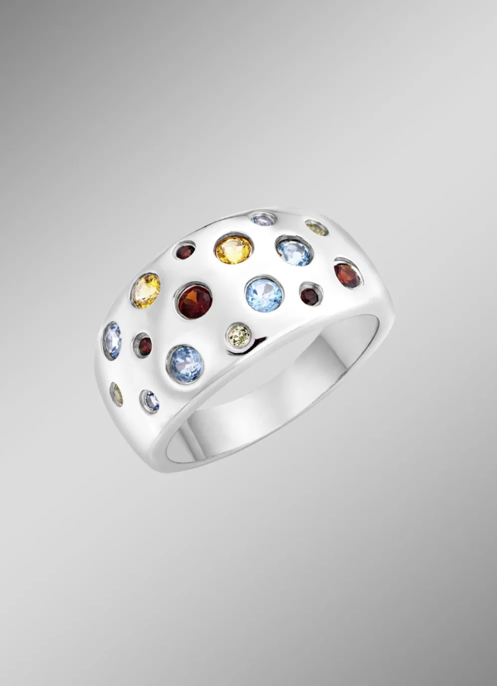 Erleben Sie die strahlende Schönheit dieses Damenrings aus Silber 925/- fein, rhodiniert für eine glänzende und langlebige Oberfläche. Dieser Ring ist mit echten Edelsteinen – Citrin, Peridot, Granat und Baby-Blautopas, beh. – besetzt, die in ihrer Farbvielfalt und Brillanz beeindrucken. Der Ringkopf ist 11 mm breit und setzt ein funkelndes Highlight an Ihrer Hand.