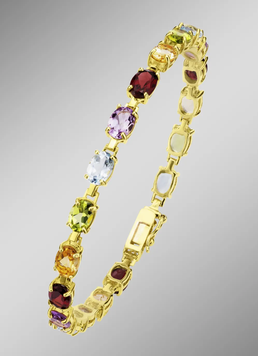 Dieses wunderschöne Armband ist aus Silber 925/- fein gefertigt und vergoldet. Es ist mit je einem echten Citrin, Amethyst, Peridot, Granat und beh. Blautopas Edelstein besetzt, welche das Armband funkeln lassen.