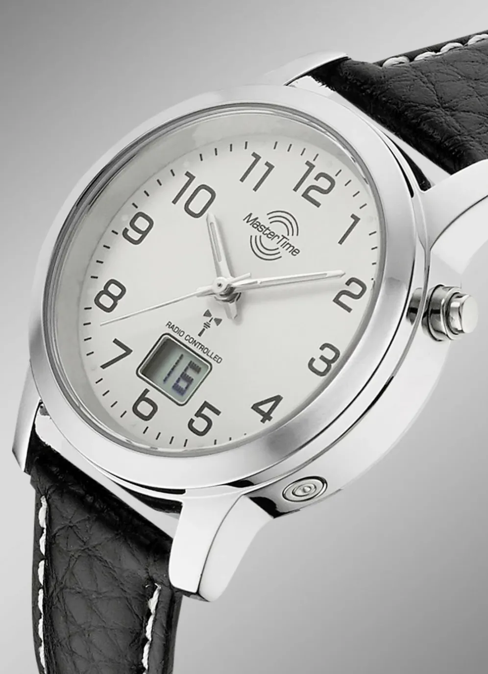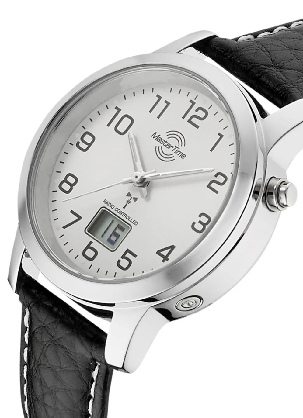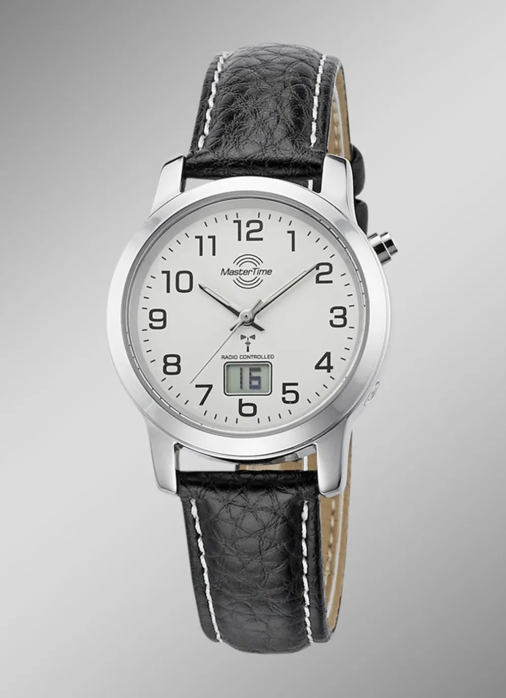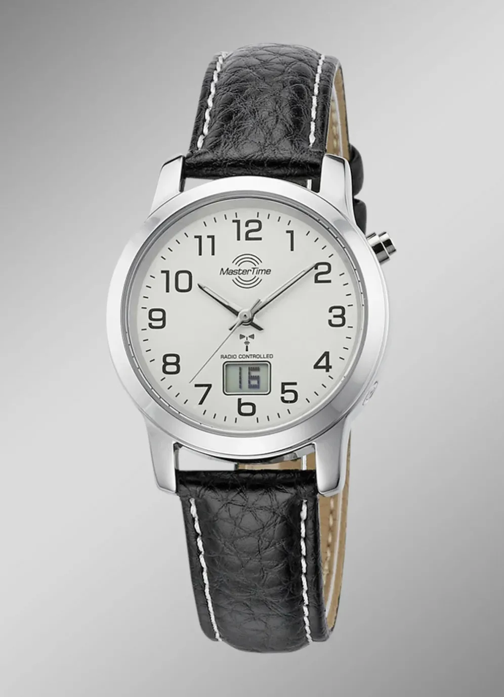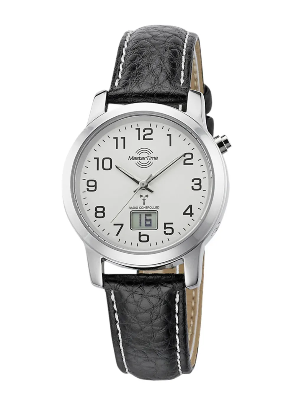 Master Time Damenuhr im klassischen Design mit silberfarbenem Zifferblatt und schwarzem Lederband mit Dornschließe. Auf dem Zifferblatt befindet sich eine digitale Anzeige mit Kalenderfunktion. Die Damenuhr hat einen Gehäusedurchmesser von 33 mm und ist bis 3 Bar wasserdicht.