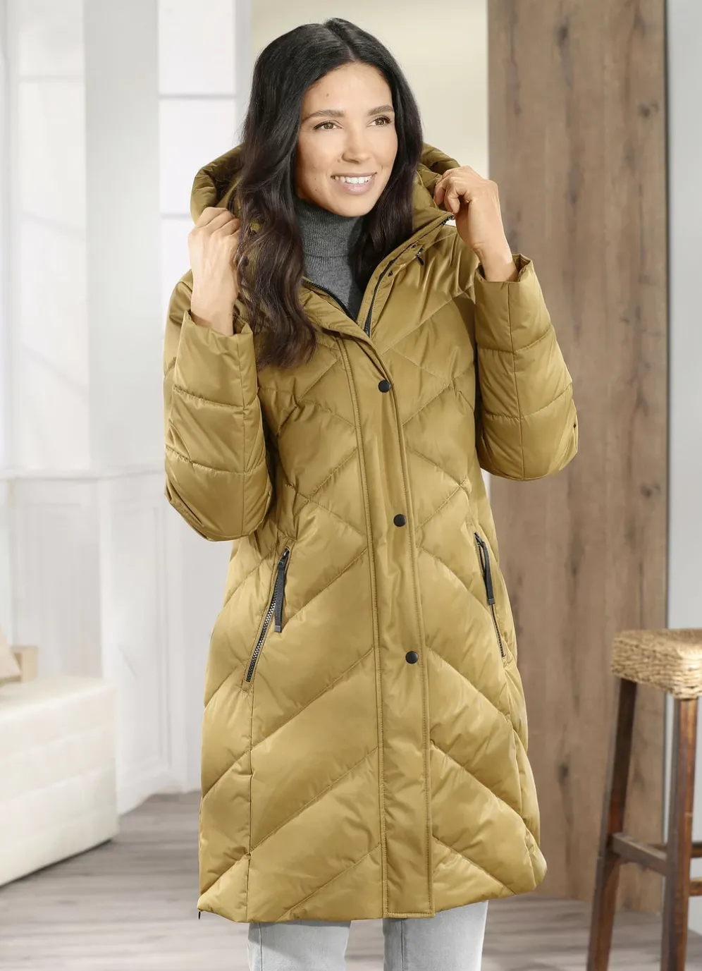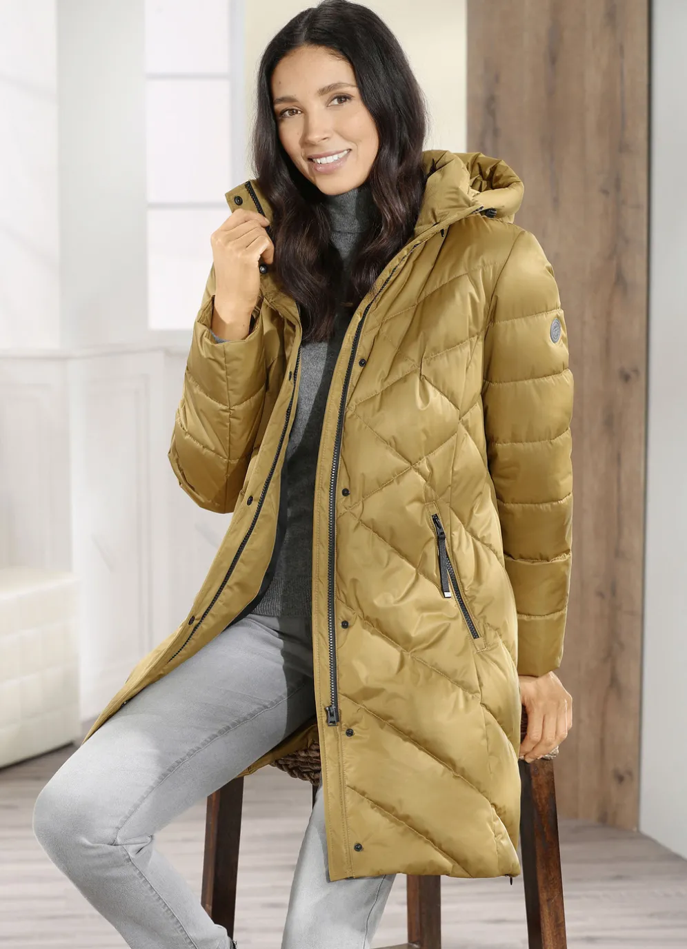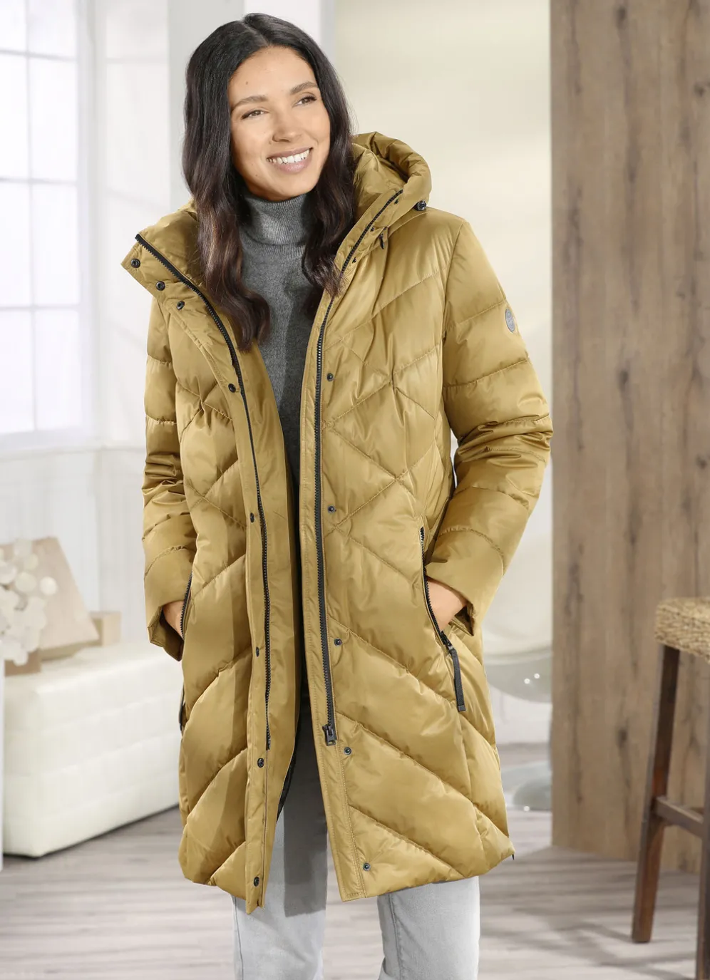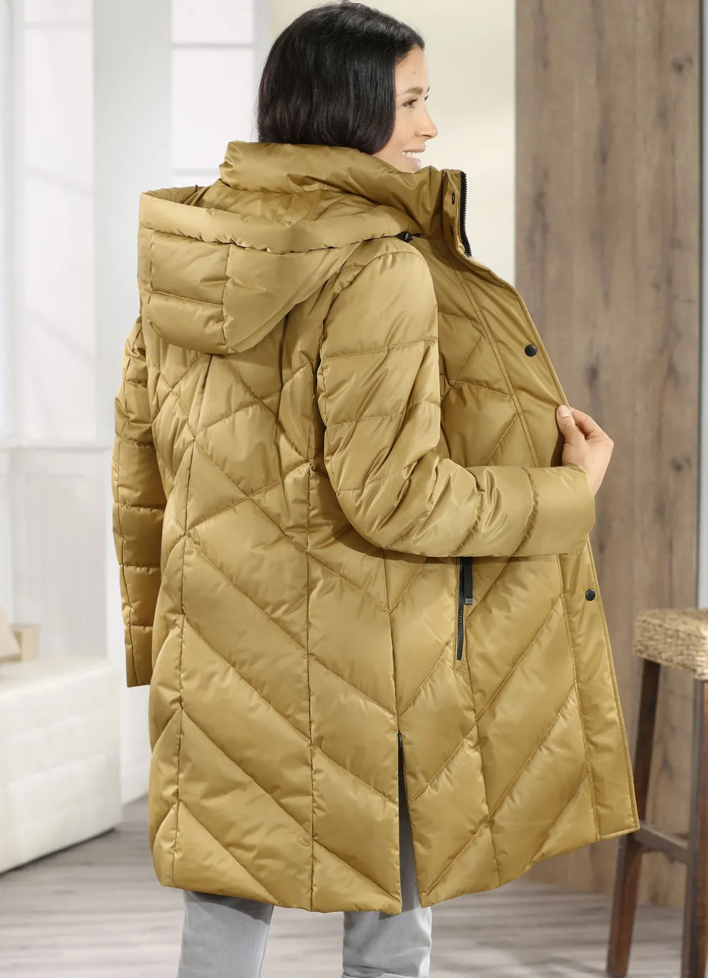 Funktions-Kurzmantel mit abnehmbarer Kapuze in Messing und in Größe 36.