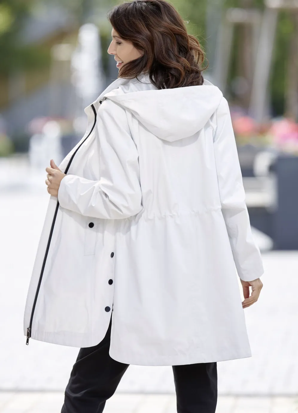 Pfifiiger Funktions-Kurzmantel: Durchzugsband und Stopper in der Kapuze und in der Taille, durch 2-Wege-Reißverschluss hoch schließbarer Steh-Umlegekragen, Schubtaschen mit Blende und Drucker, elastische Windfangärmel, Seitenschlitze mit Drucker, eine Innentasche sowie leicht verlängertes, abgerundetes Rückteil. Länge ca. 89 cm.