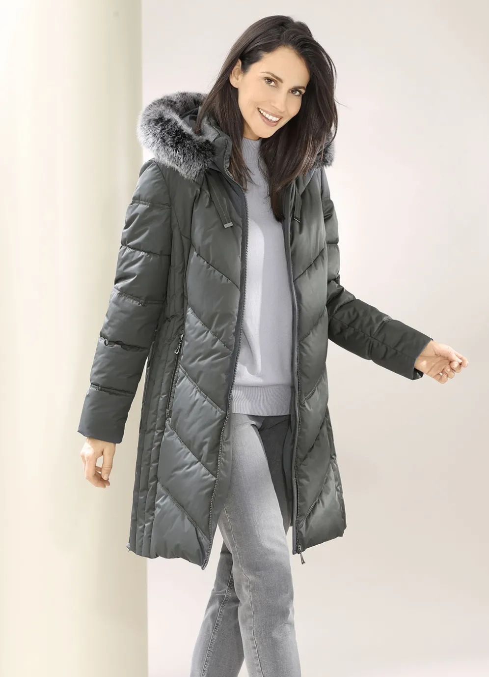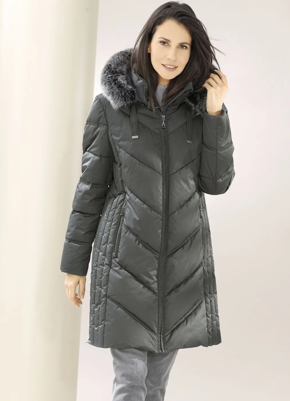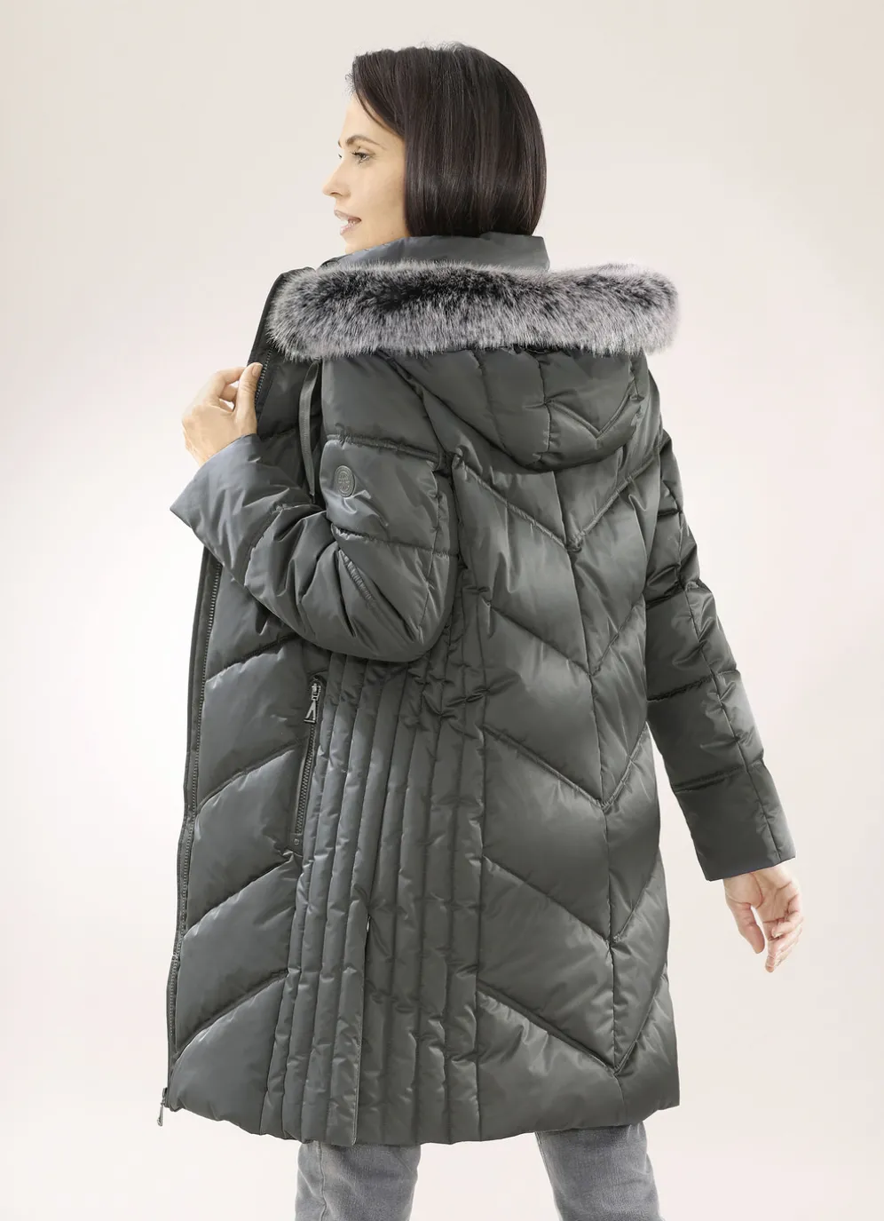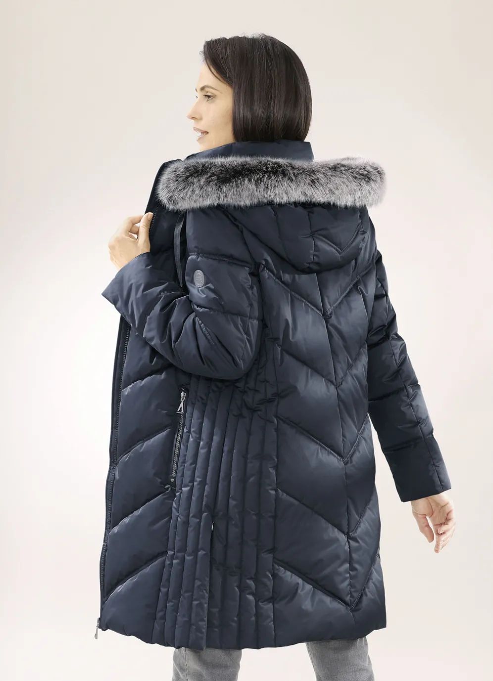 Attraktiver Funktions-Kurzmantel mit figurschmeichelnder Längssteppung seitlich, fester Kapuze mit Durchzugsband, Stopper und abnehmbarem Kunstpelz-Besatz, durch Reißverschluss hoch schließbarem Stehkragen, Reißverschluss an den Paspeltaschen und Seitenschlitzen, umschlagbaren Ärmeln sowie einer Innentasche. Länge ca. 90 cm.