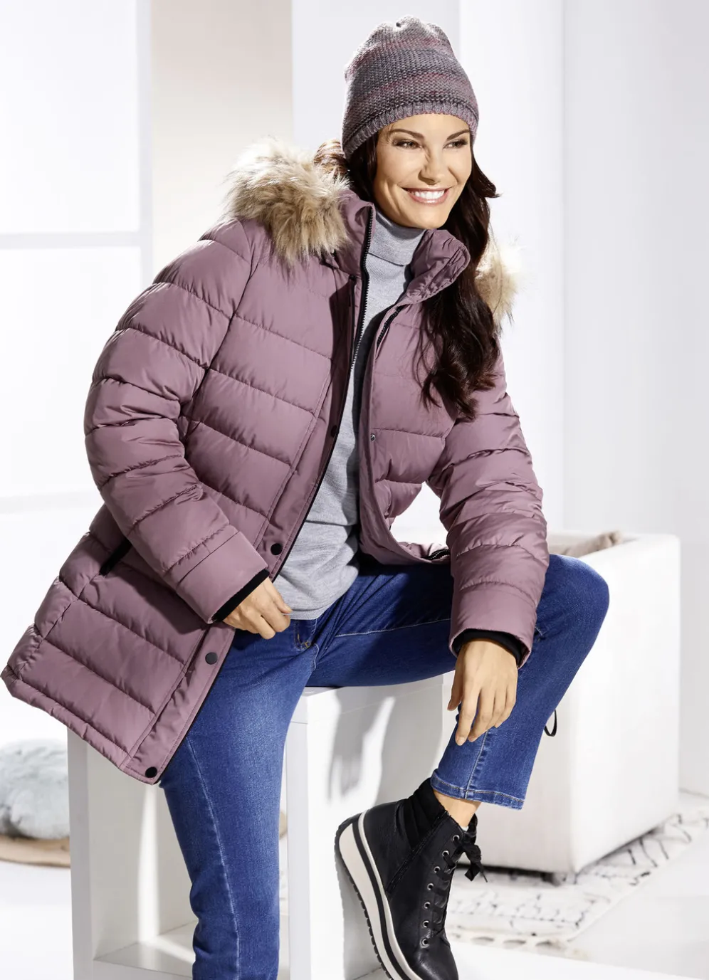 Aparte, malvefarbene Funktions-Longjacke: abnehmbare Kapuze mit Durchzugsband, Stopper und abnehmbarem Kunstpelz-Besatz, durch 2-Wege-Reißverschluss unter der Druckerleiste hoch schließbarer Stehkragen, Reißverschlusstaschen, Umschlagärmel mit Windfang aus Rippenstrick, eine Innentasche sowie leicht verlängertes, abgerundetes Rückteil mit Schlitz und Durchzugsband. Länge ca. 85 cm, ab Gr. 40 ca. 86 cm, ab Gr. 44 ca. 87 cm, ab Gr. 48 ca. 88 cm, bei Gr. 52 ca. 89 cm.