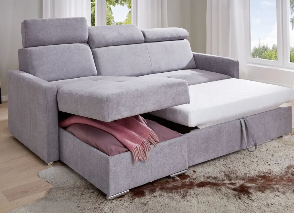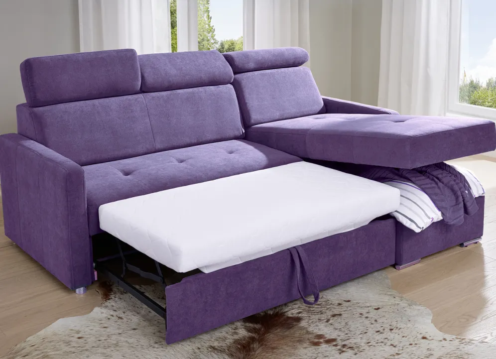 Funktions-Polsterecke mit Bettkasten in Violett.