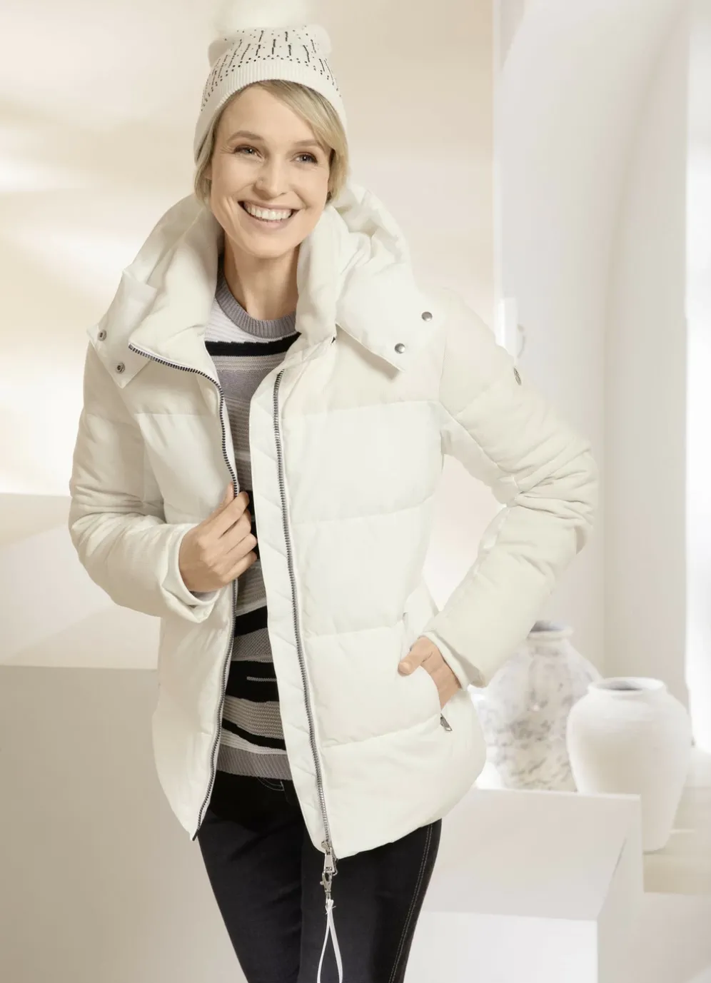 Funktionsjacke im Puffer-Style: durch 2-Wege-Reißverschluss hoch schließbarer Stehkragen mit abnehmbarem Schlüsselband, Eingriffstaschen mit verdecktem Reißverschluss, Cord-Einsätze sowie eine Innentasche. Länge ca. 66 cm, Gr. 40 ca. 68 cm, ab Gr. 44 ca. 70 cm, ab Gr. 48 ca. 72 cm, bei Gr. 52 ca. 74 cm.