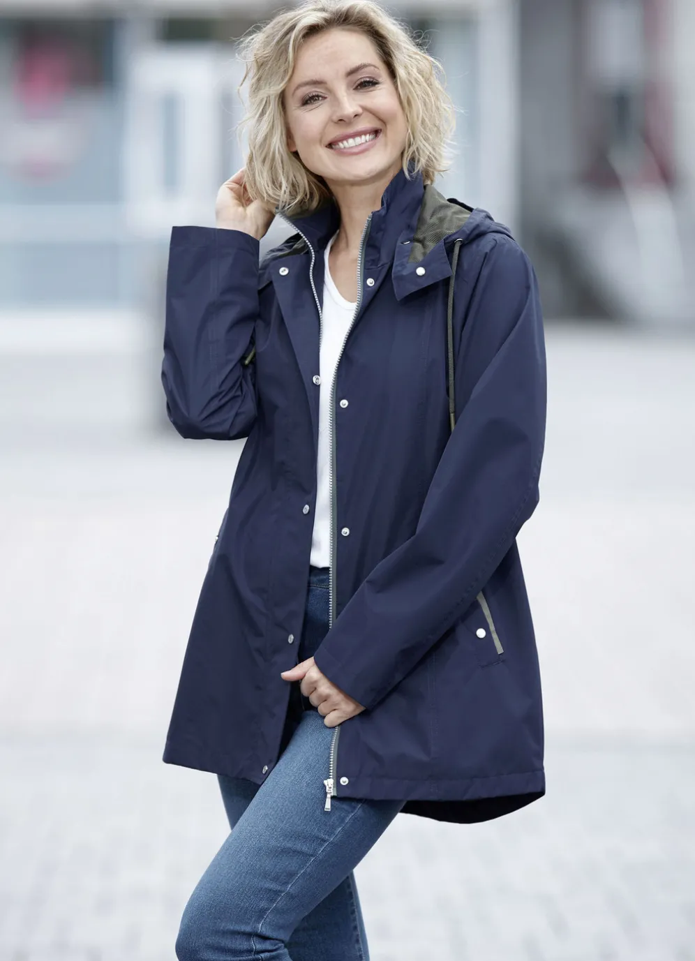 Funktionsjacke: abnehmbare Kapuze mit Riegel, Drucker, Durchzugsband und kleinem Regenschild, durch Reißverschluss unter der Druckerleiste hoch schließbarer Stehkragen, Schubtaschen mit Druckern, Durchzugsband und Stopper in der Taille, umschlagbare Ärmel, eine Innentasche sowie geschlitztes Rückteil mit Reißverschluss. Länge ca. 80 cm, ab Gr. 48 ca. 82 cm.