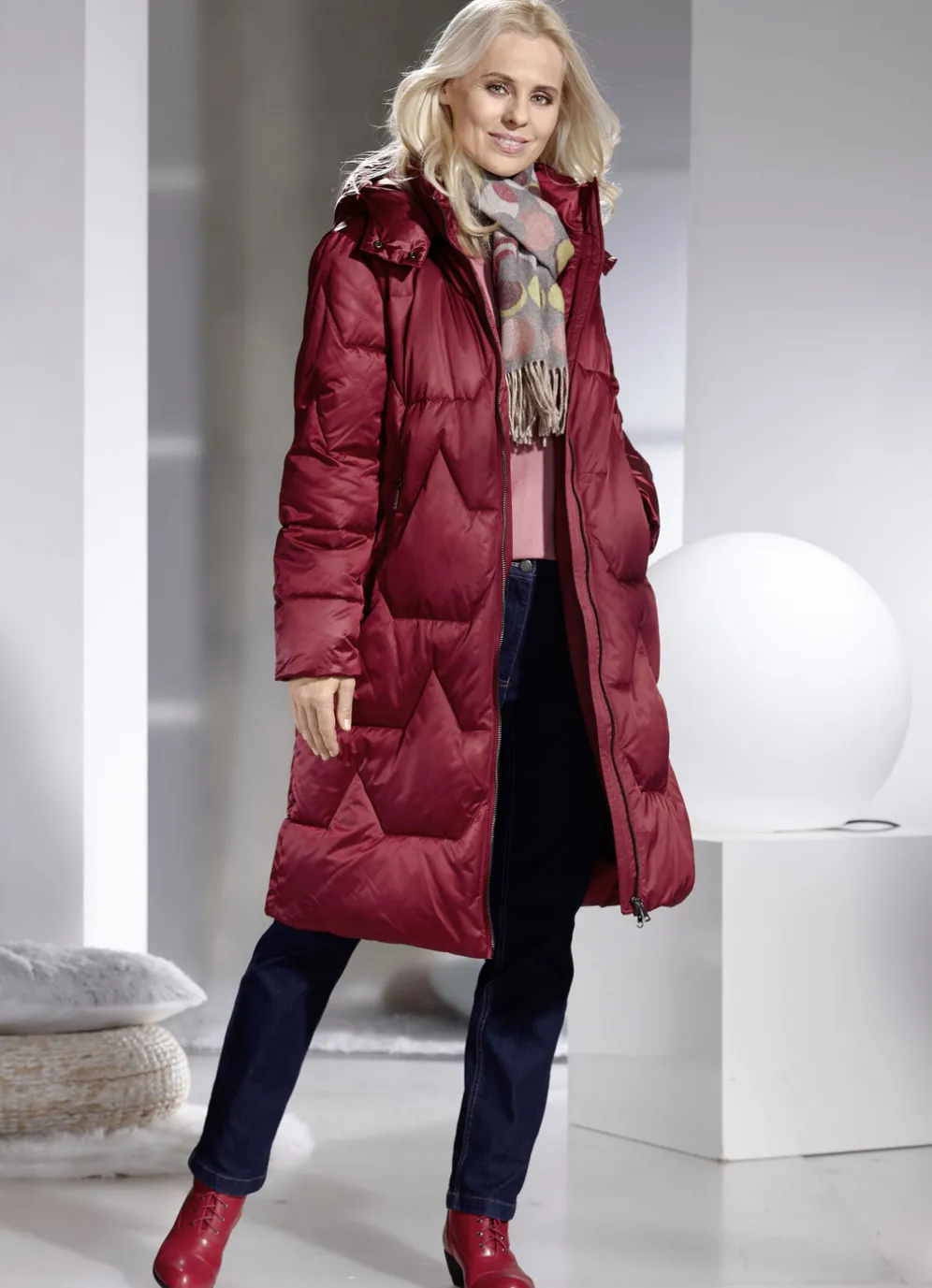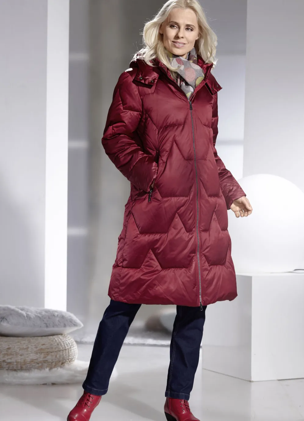 Funktionsmantel im Puffer-Style in Burgund und in Größe 34.