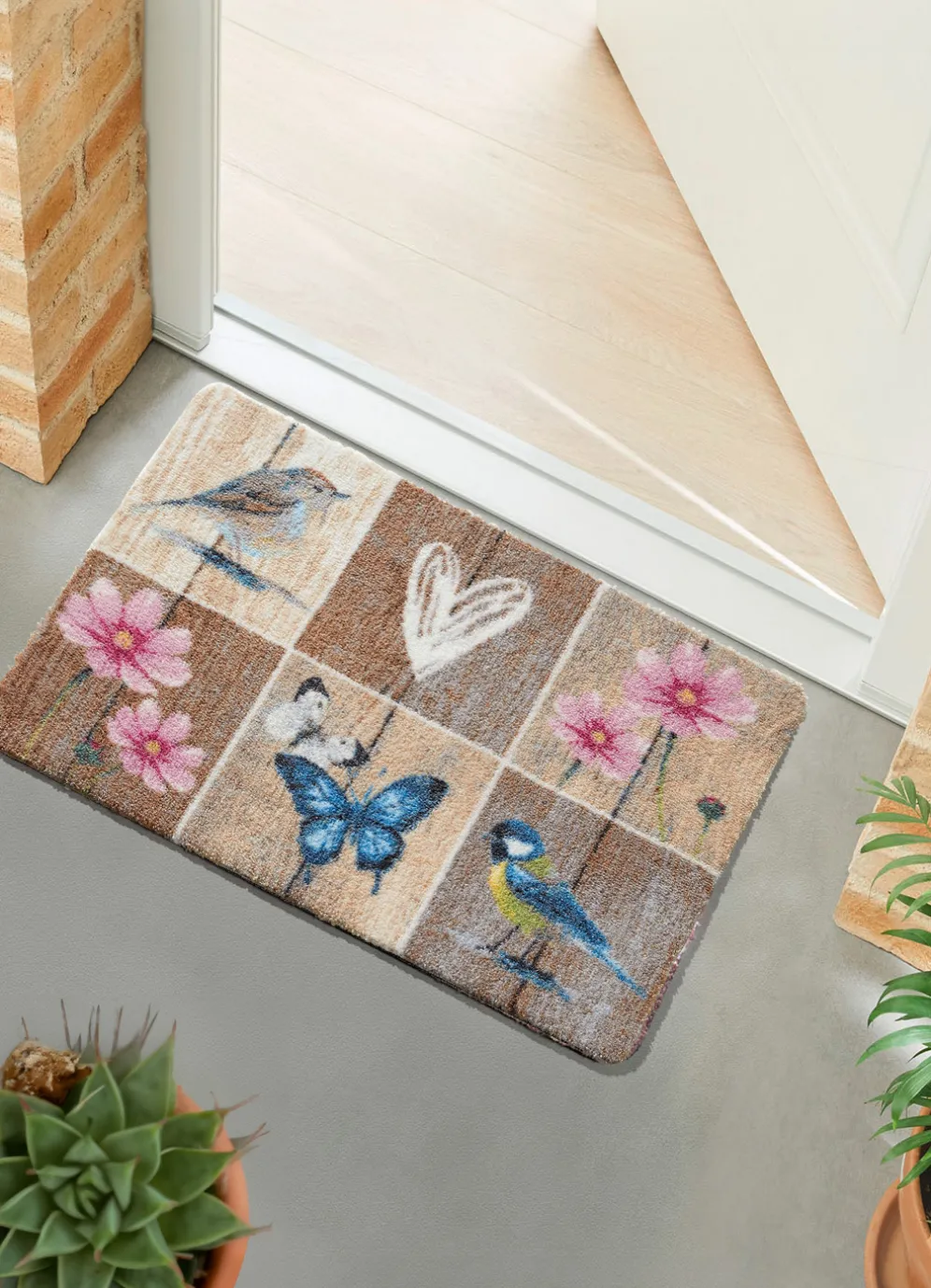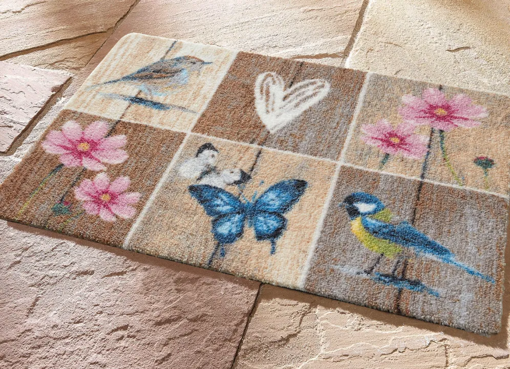 Diese fröhliche Fußmatte in frühlingshafter Patchwork-Optik ist eine perfekte Begrüßung für Ihre Gäste! Mit rutschhemmender Latex-Rückseite gefertigt. Die Qualität: 100% Polyamid. Waschbar bis 30 °C und für Trockner und Fußbodenheizung geeignet.