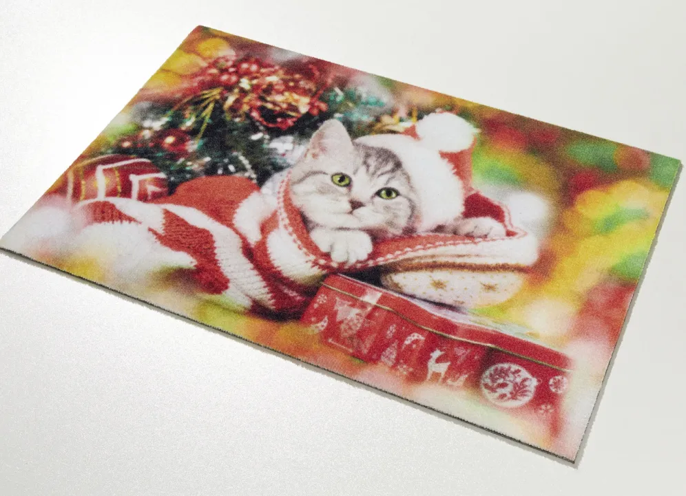 Diese bezaubernde Fußmatte mit niedlichem Weihnachtskätzchen-Motiv bringt festliche Stimmung direkt an Ihre Haustür. Mit rutschfester Rückseite. Gesamthöhe: 5 mm. Qualität: Velvet aus 100% Polyamid. Waschbar bis 30 °C. Maße: 40×60 cm.