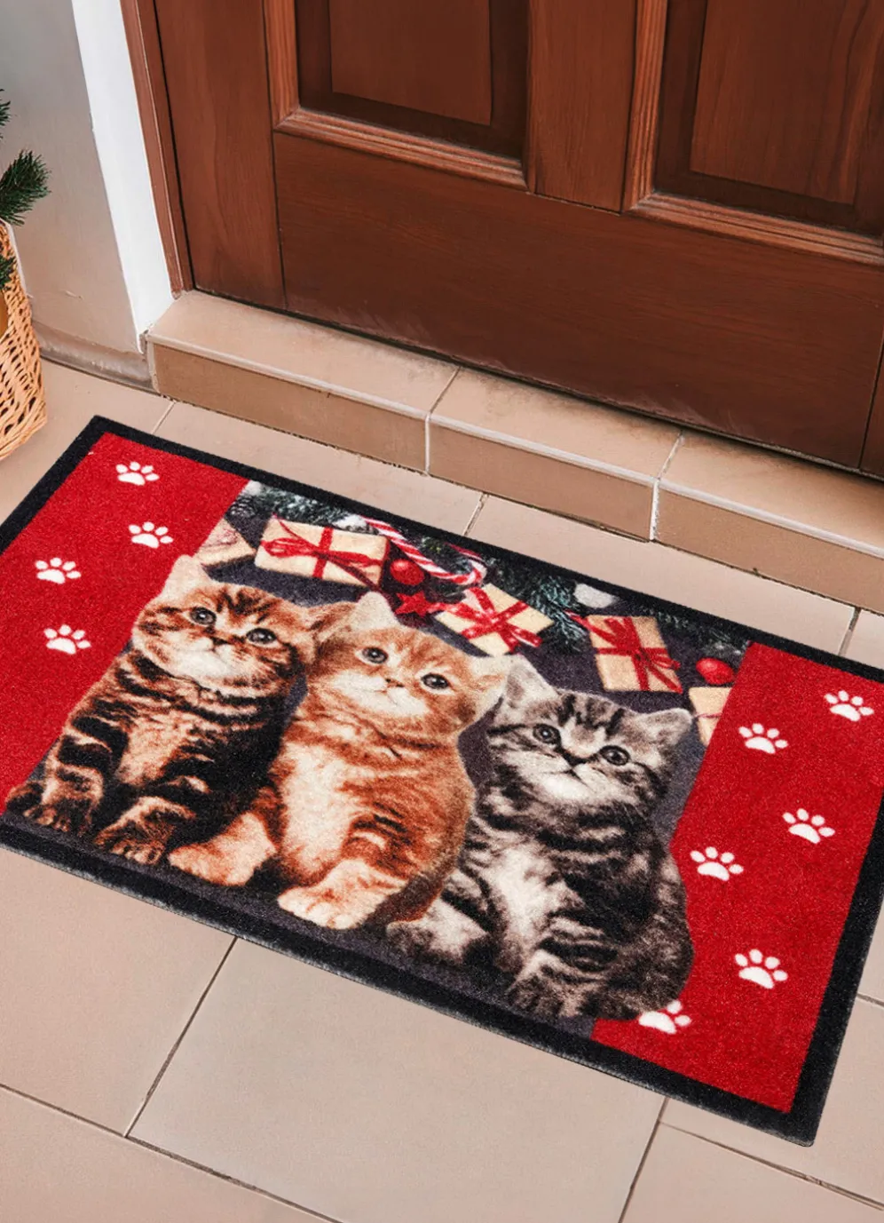 Die drei süßen Kätzchen auf dieser weihnachtlichen Fußmatte warten nur darauf, Sie und Ihre Gäste begrüßen zu dürfen. Mit rutschhemmend beschichteter Rückseite. Qualität: 100% Polyamid.