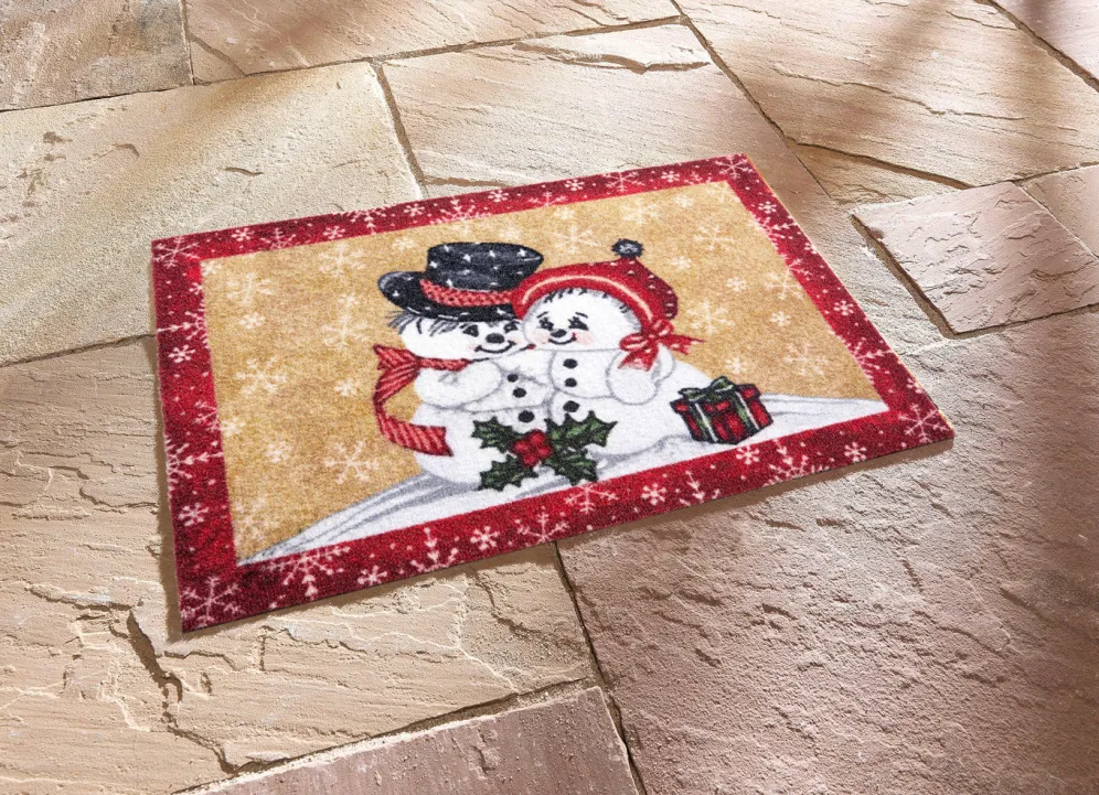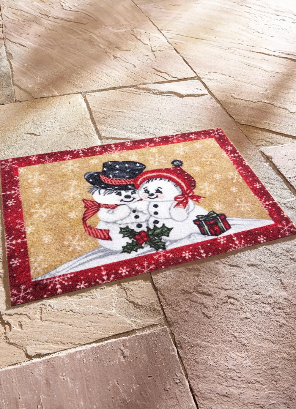 Ganz romantisch kuschelt sich das Schnee-Ehepaar auf dieser Fußmatte aneinander, während sie glücklich die tanzenden Schneeflocken beobachten. Mit rutschhemmend beschichteter Rückseite. Qualität: 100% Polyamid. Maße: 40×60 cm